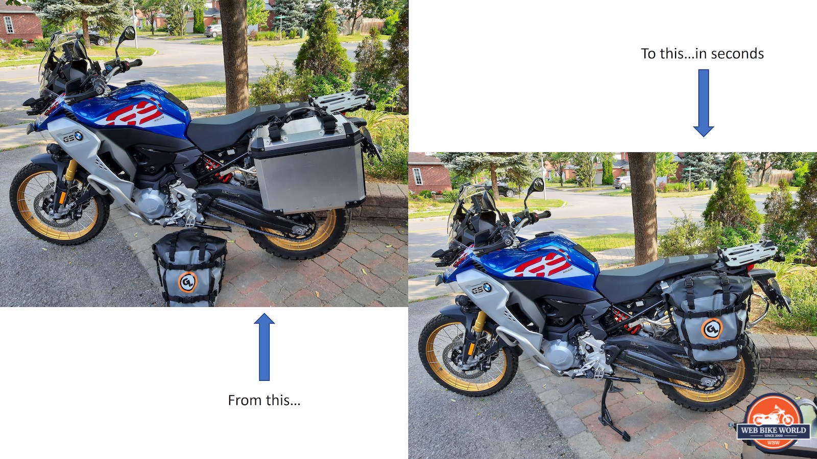 And, switching between the use of the BMW GS ADV aluminum panniers or the GL Pannier Mounts with MotoTrekk Panniers (and whatever) is a 20 to 30-second effort or less – convenience, versatility, and efficiency.