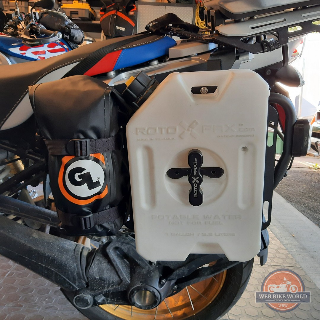 Two favoured layouts for shorter off-road forays or day trips see the Fuel and/or Water RotopaX containers fitted to one or both GL Pannier Mount plates (fuel container never on the exhaust side) along with one of the Possibles fitted closest to the rider.