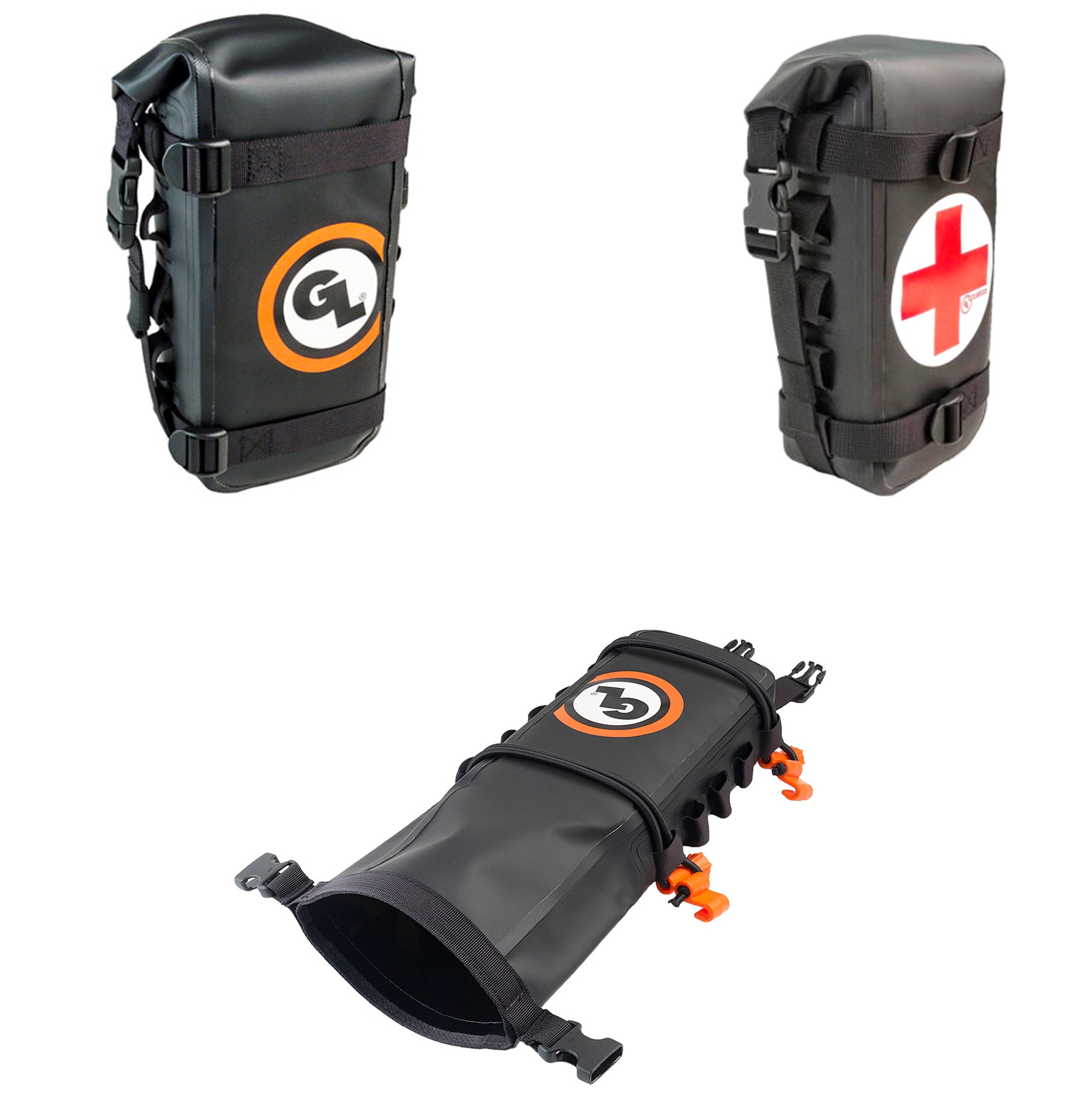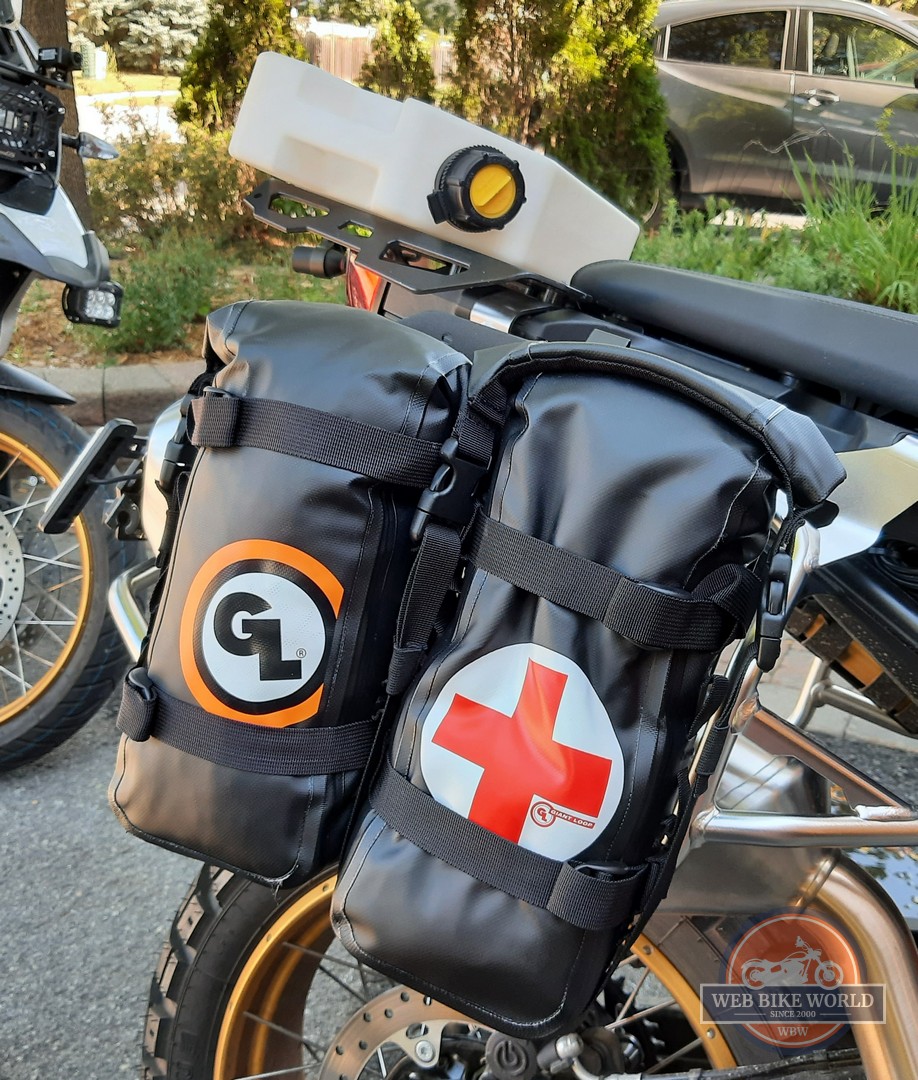 Specifically, the standard GL logo and First Aid symbol marked Possibles are typically used as a set, either on the front or back of the GL MotoTrekk Panniers or on the backs when drink or other MOLLE-style strap-based containers are utilized on the front and thus closer to the rider.