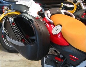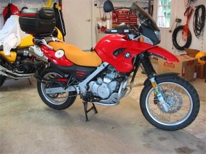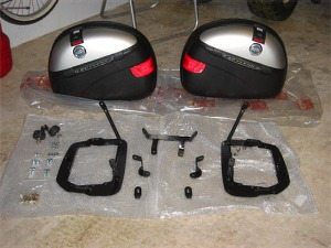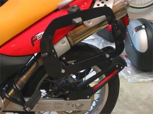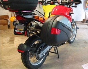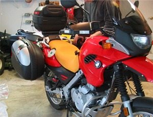 Mounting new Givi saddlebags on Erik Stephens’ (Twisted Throttle) BMW F 650 GS on a very rainy Sunday afternoon.