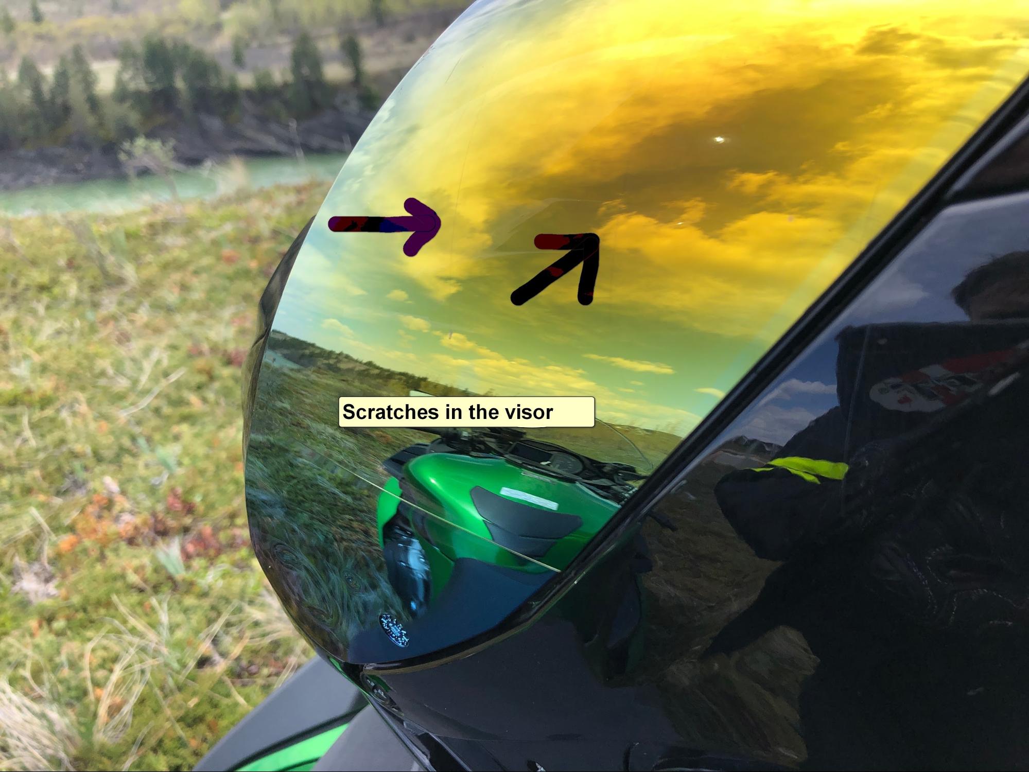 This helmet loves to take on damage even with ordinary use. After several hundred miles of riding and handling it’s covered in mostly fine scratches and light blemishes. This includes the beautiful Iridium finish on the visor just from wiping away rain with the rubber strip on the index finger of my Rukka Virium gloves. This hasn’t happened on any other visor I’ve tested.