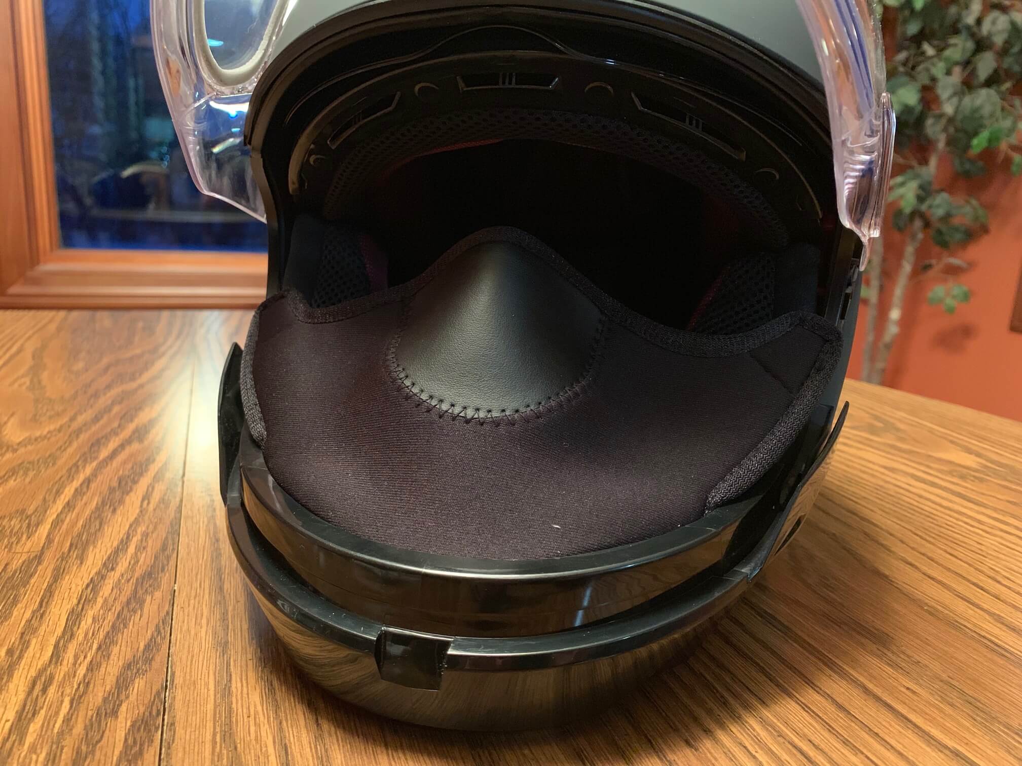 The breath guard is very large and has a leather piece that goes over your nose which will shape to the contours of your face. It’s designed to keep your face warm during snowmobiling but if you’re a die-hard winter rider this is the helmet for you.