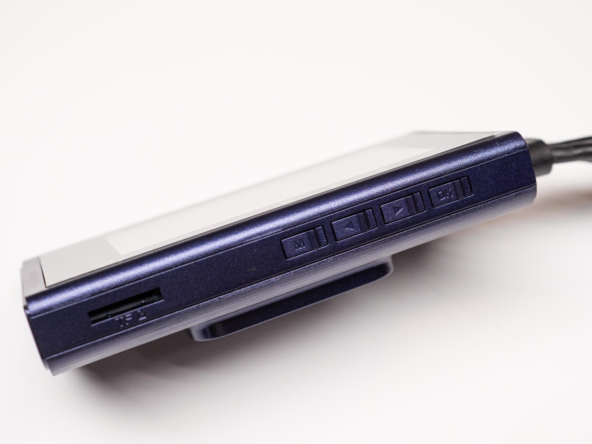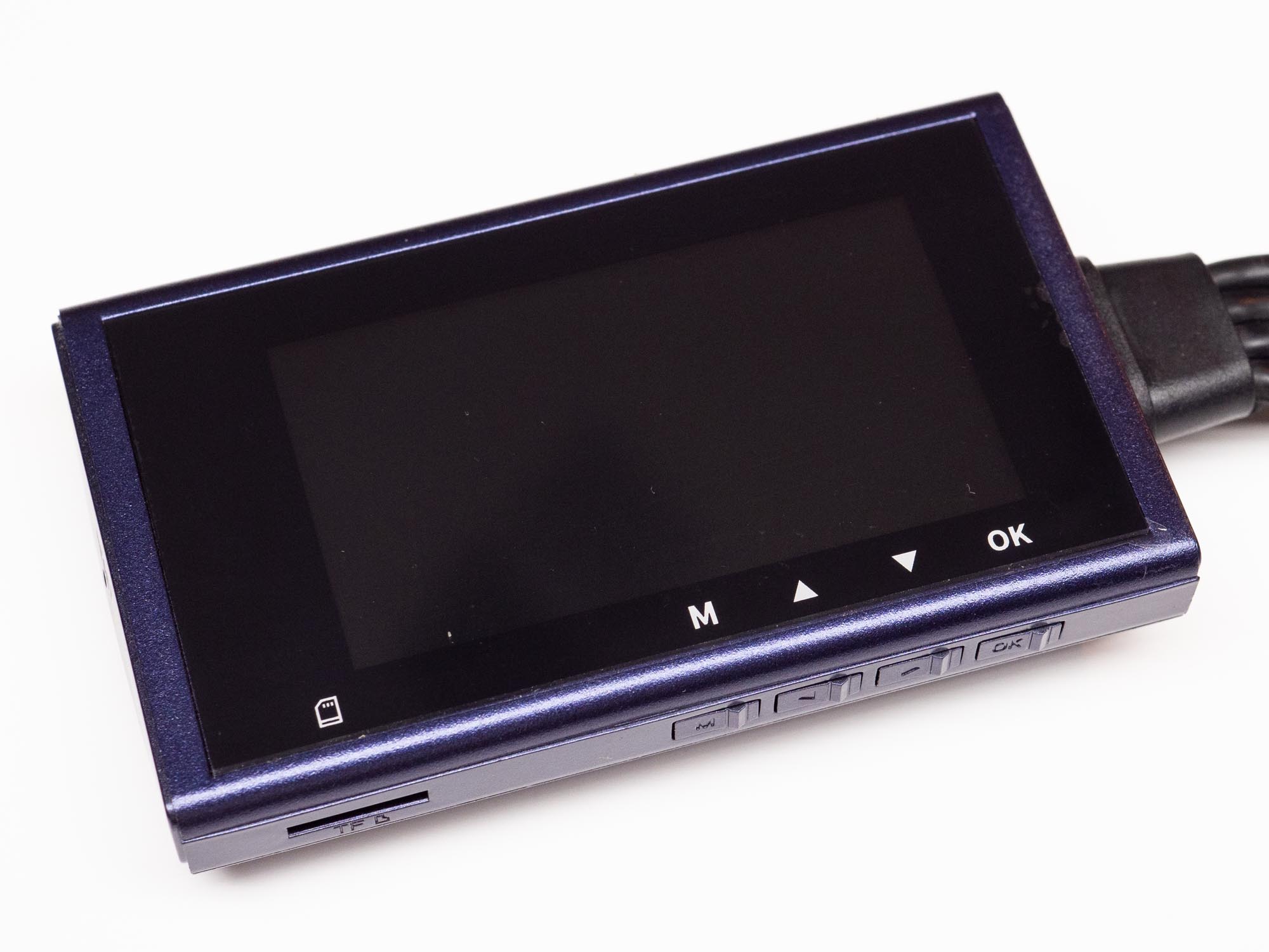 On the DVR unit is a 2.75 inch (70mm) screen for viewing live and recorded video as well as menus for device setup. The top edge has a single button to power on the DVR module. On the long lower edge are four buttons for navigating the menus as well as a MicroSD card slot.