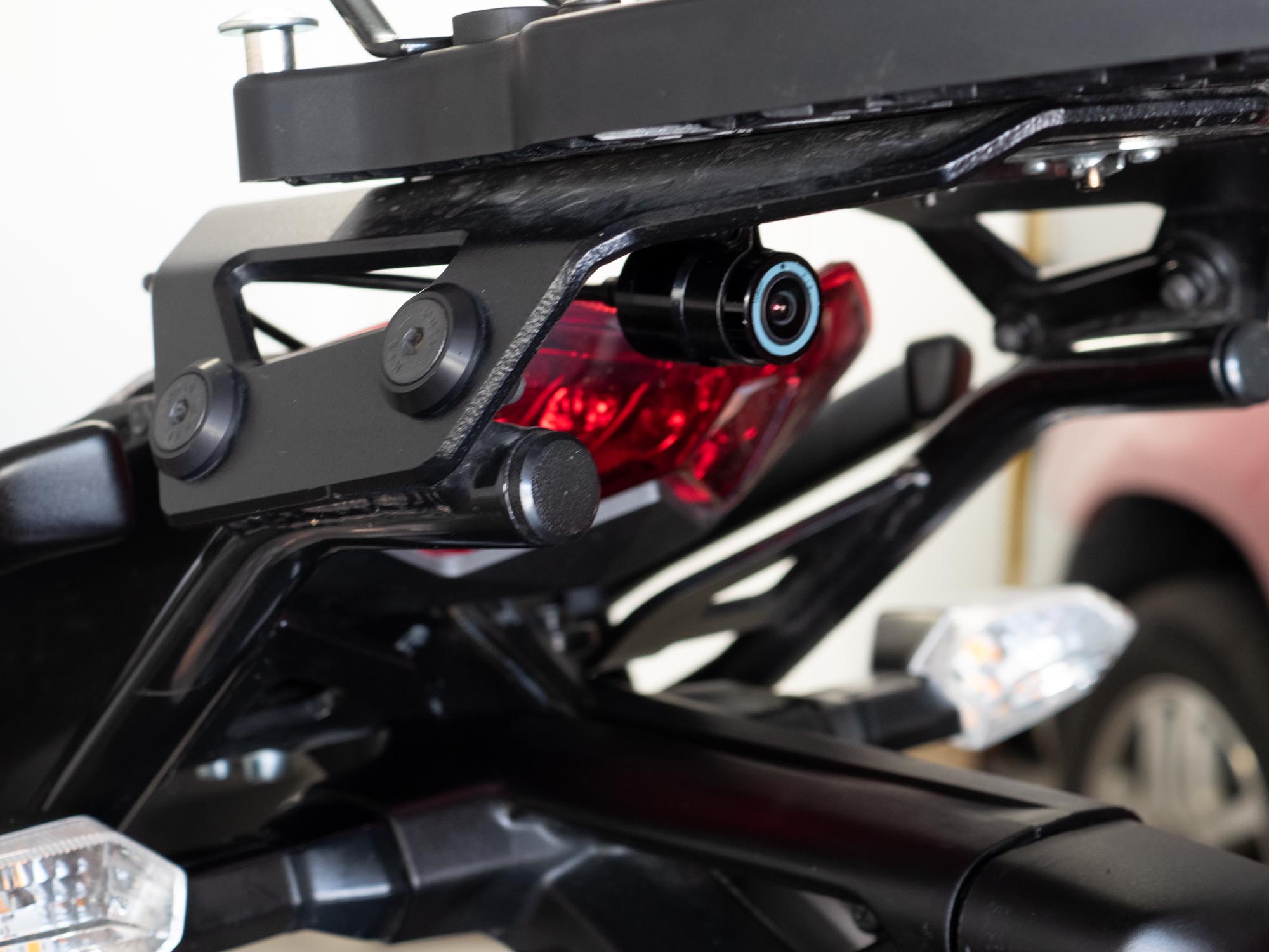 Next, place the cameras. I wanted to put the cameras in unobtrusive locations that also offered a decent view. The rear was easy enough on my bike as I just attached it under the top case rack. This offered a good view of the rear which, while it does cut off some of the tops of the view, provides more than enough view to do the job as a “dashcam”.