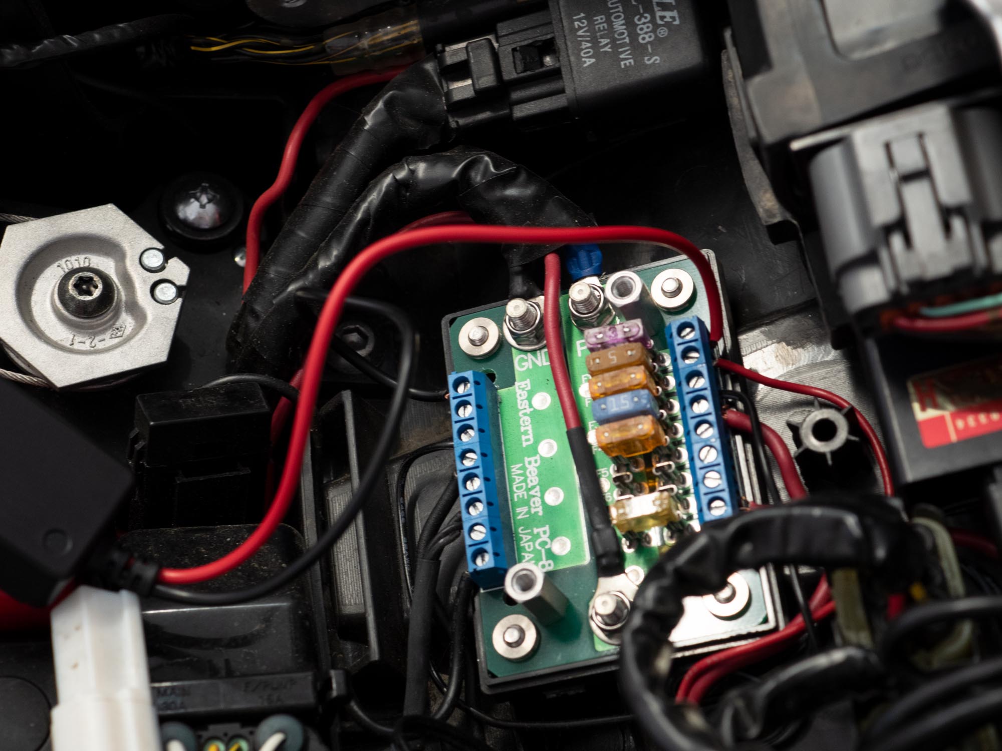 I’ll start with the last point first. The power supply module should be connected to a switched power source such as running lights or other “ignition on” source. I already have an Eastern Beaver fuse panel installed under the seat of my bike so I have switched power already available.