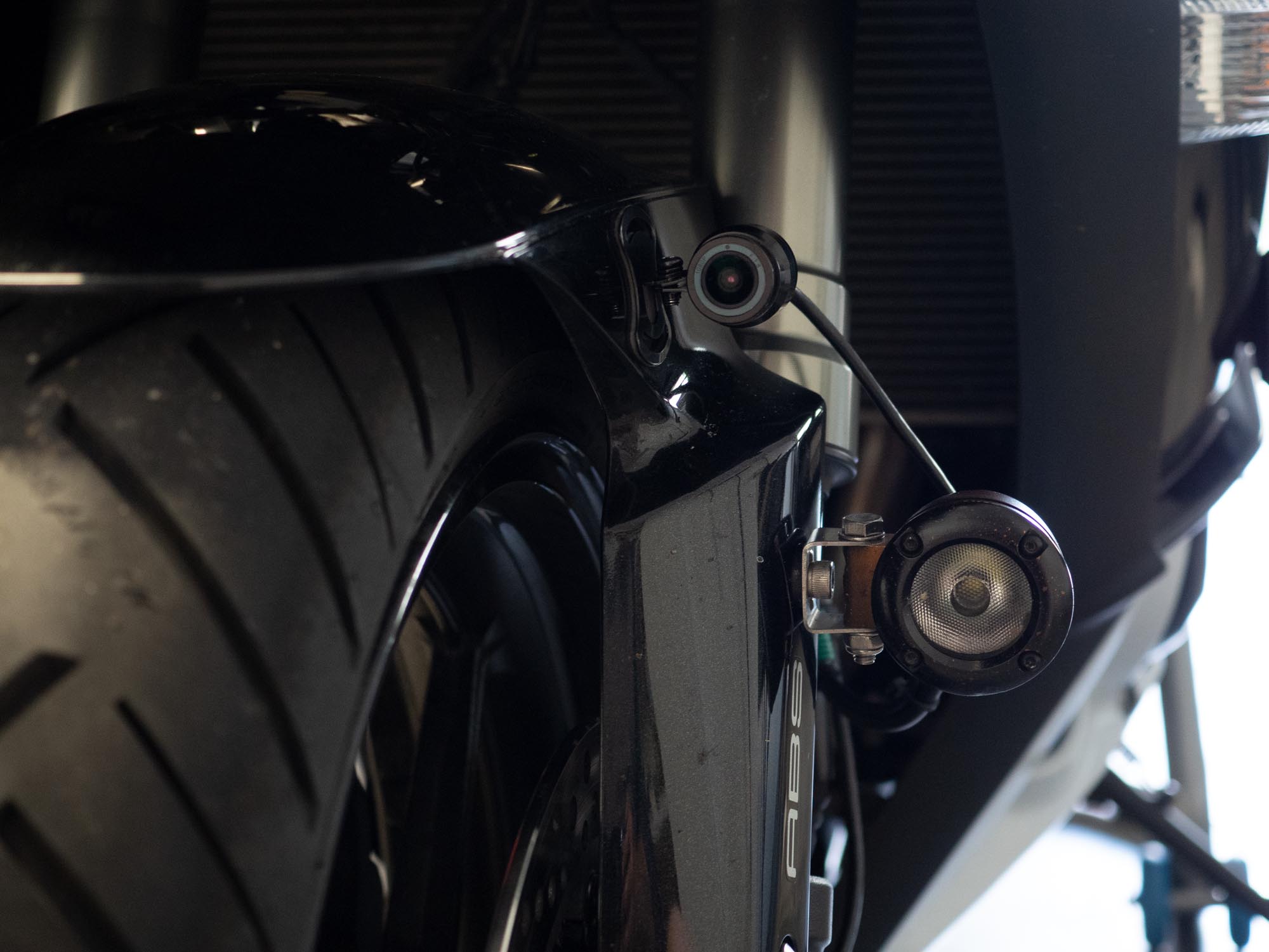 The front was a little more difficult as I couldn’t find a place I felt good about. Right under the fairing nose posed the possibility of the camera contacting the front fender over a big bump and there weren’t other places I liked. Eventually, I attached it to the side of the front fender. This location does have a portion of the fender blocking some of the right side views but still offers enough view to do the job of “dashcam”.