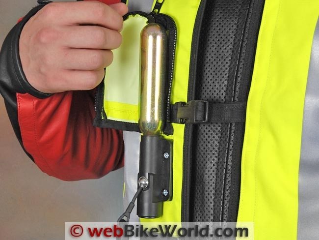 Actually, calling it a “CO2 vest” or “carbon dioxide inflatable vest” would probably be more accurate than “airbag”, as the vest is inflated from the pressure in a CO2 cartridge attached to the front.