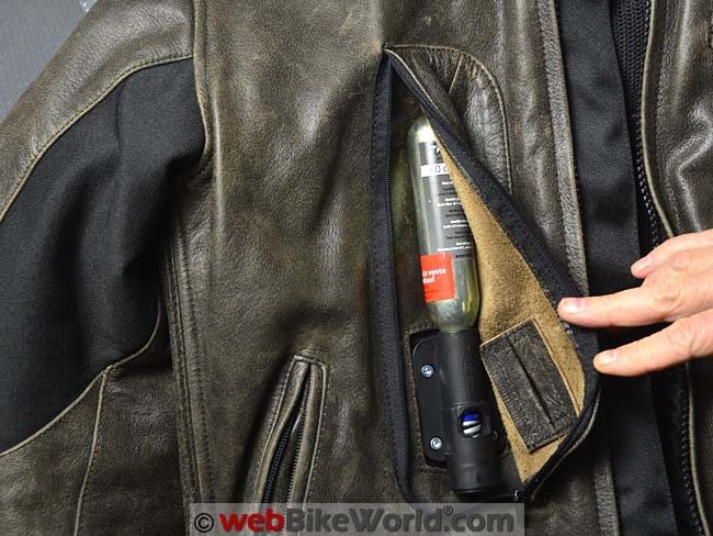 On the Helite leather airbag jacket, the CO2 cartridge is hidden behind a large vertical zipper on the right side of the jacket in front. It’s more obvious than the semi-hidden CO2 inflator on the Adventure jacket, but not by much.
