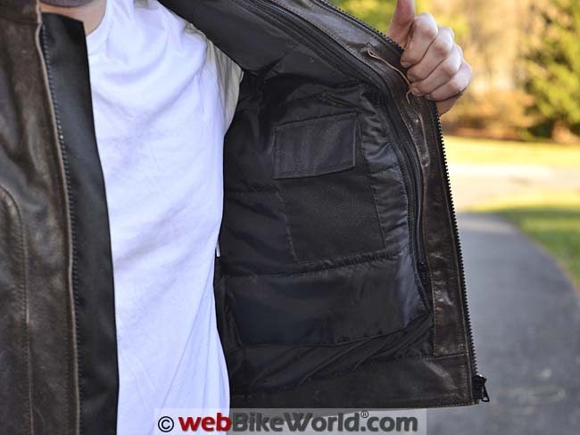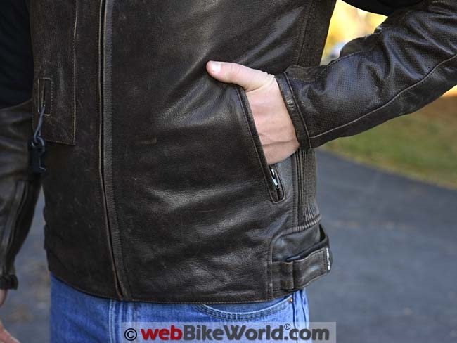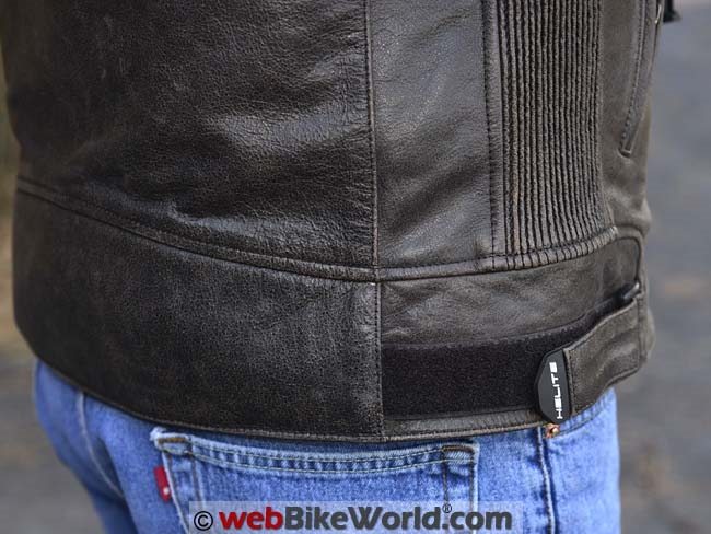 The jacket has a hook-and-loop leather belt along the bottom of the hem under the arms for adjustment of the waist. These are leather straps that feed through square plastic D rings for the adjustment and there’s plenty of adjustment room. There is no attachment belt on the inside of the jacket shell that could be used to attach the jacket to pants.