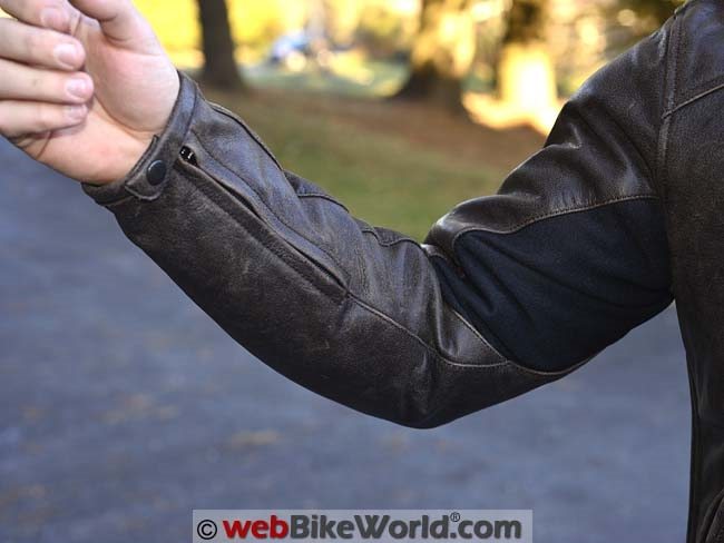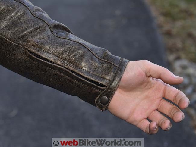 The sleeve cuffs are straightforward; each sleeve fastens at the cuff with a zipper and an unbranded metal snap. Both sides of the snap are press-riveted to the leather and have a antiqued dark bronze finish on the brown jacket.