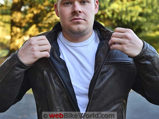 The leather jacket has a neoprene rolled edge along the top of the collar for comfort.