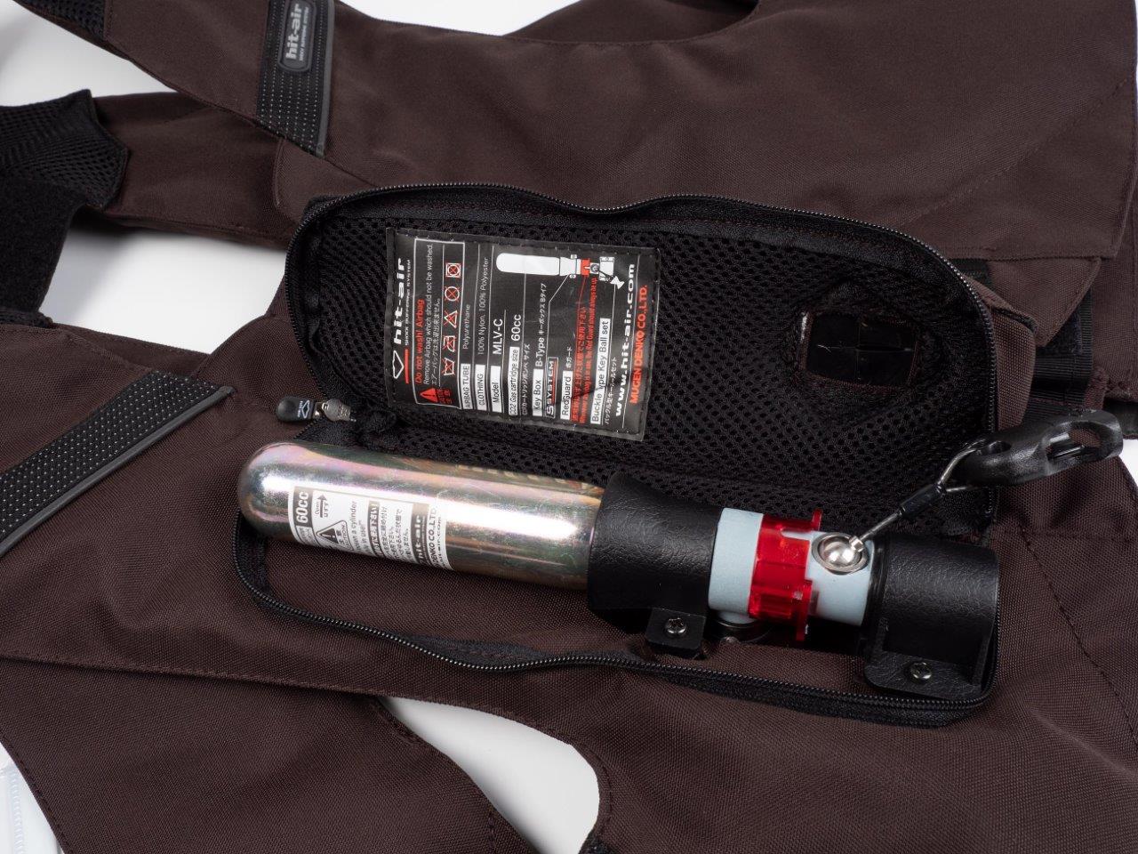 Located on the right front side is the zippered pocket containing the CO2 cartridge and mechanism for inflating the vest. This access point is used to replace the gas cylinder after use or the entire mechanism, or “keybox”, can be replaced if it is damaged in a crash. The keybox sits on top of the bag so the hard parts are kept away from the rider’s body in an impact.