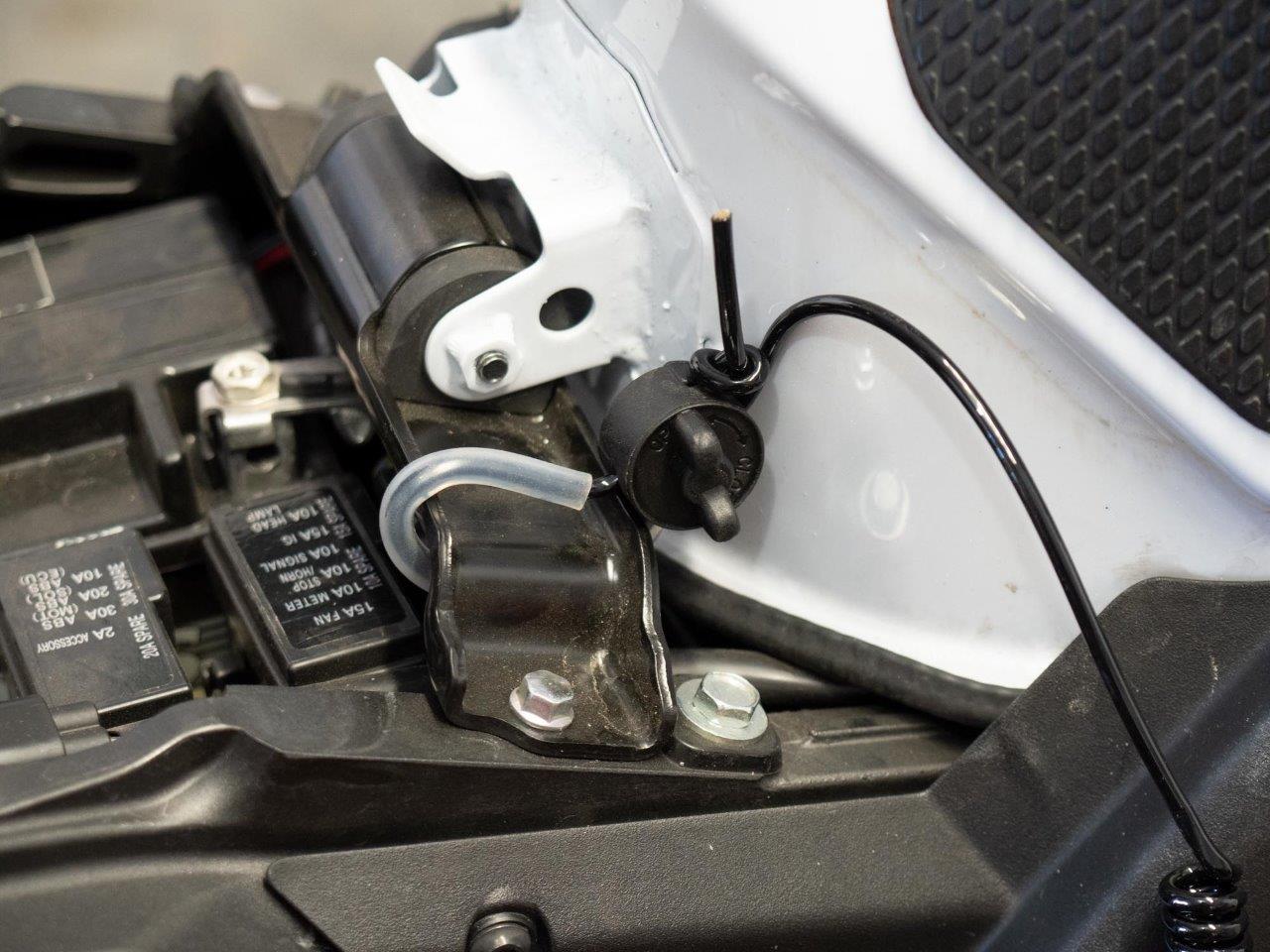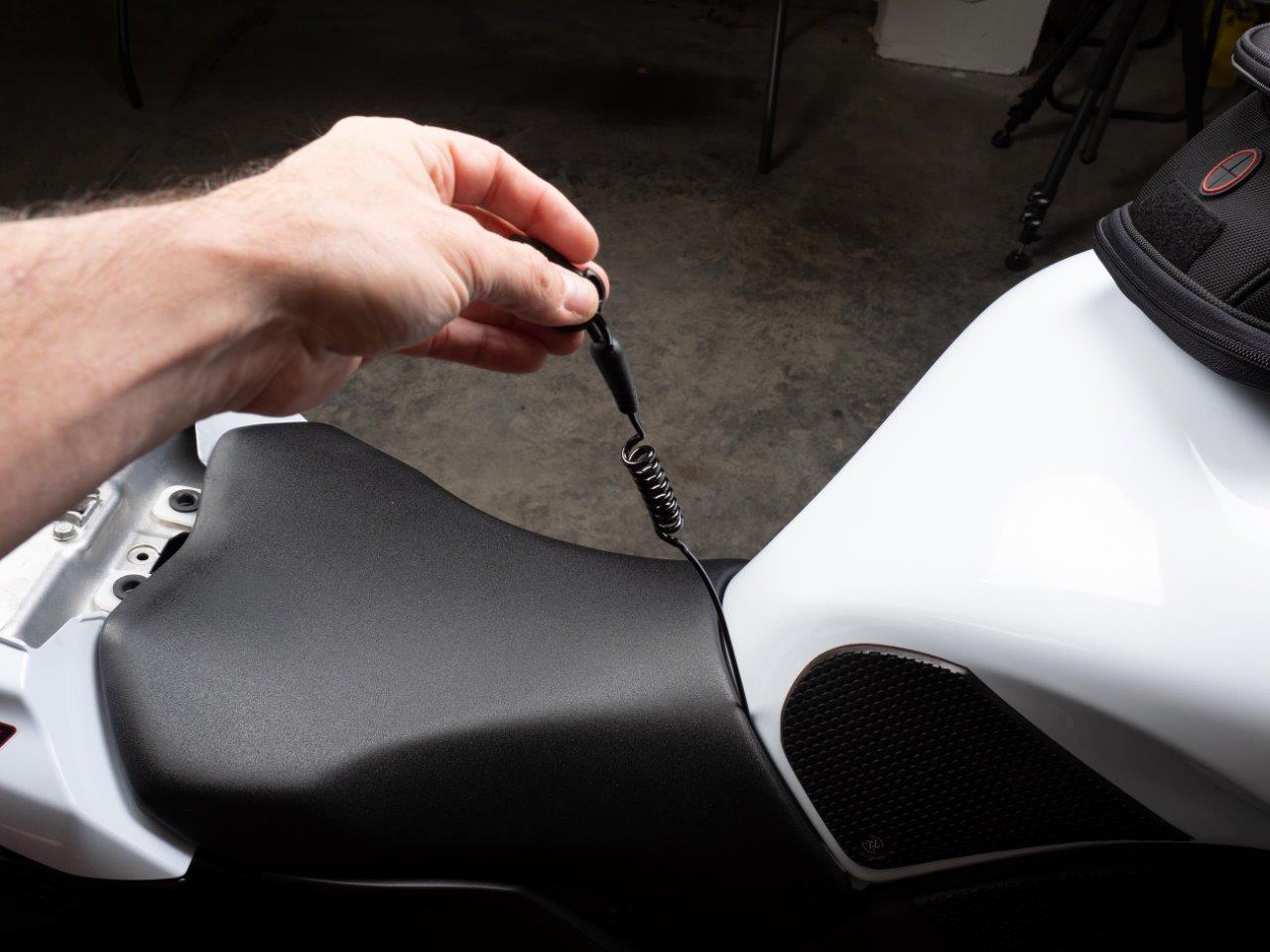 Under the seat of my Ninja 1000 is the fuel tank support strut which is an ideal place for anchoring the tether. This location allows me to keep the anchor point hidden and without the bike key to remove the seat, the tether can’t be removed short of cutting it off above the seat rendering it pretty useless.