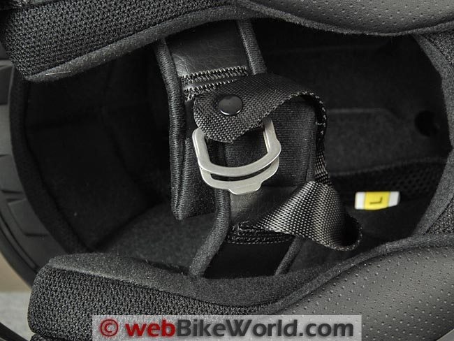 The HJC CL-Max II has a double-D ring chin strap attachment system. The padding under the chin strap is very nice and comfortable and seems longer or more substantial than many other helmets, including the expensive Arai helmets, which typically have chin strap padding that is too short.