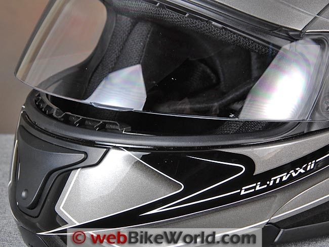 The face shield removal system on the CL-Max II is very easy to use, as illustrated in the video below. Lift the face shield all the way up and press the lever release on either side and the face shield pops right out. By the way, the face shield measures 2.06 mm thick and it has the lift tab on the lower left-hand side.