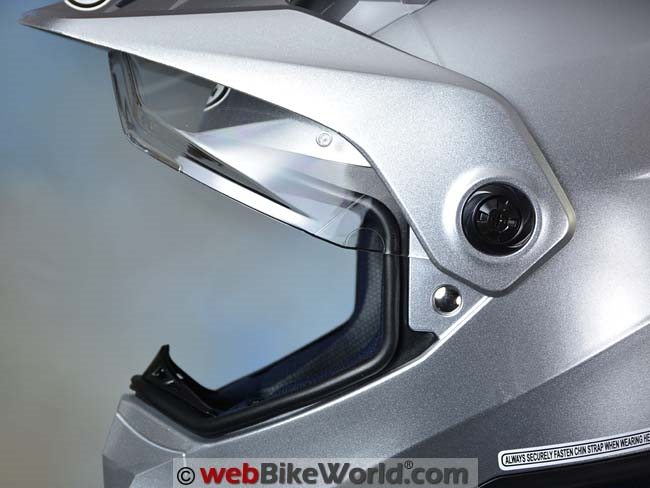 The face shield rotates through only 3 detents and there’s no first small detent for city defogging — important on a DS helmet because when you’re standing on the ‘pegs and going slow off-road, you’ll need the ventilation.