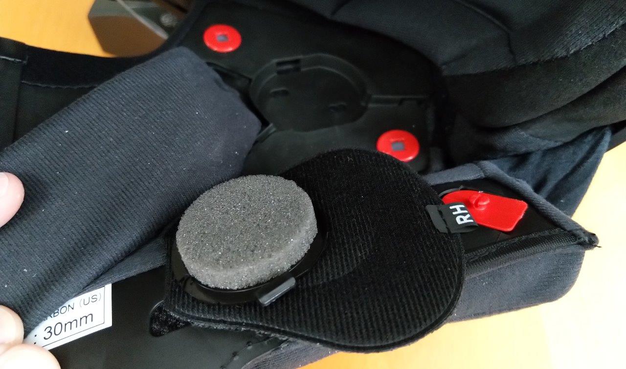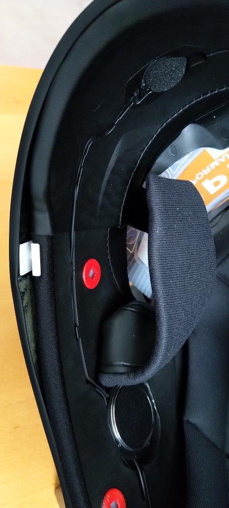 - Microphone – connect the thin wire piece to the connector, mount the small hook-n-loop round to the microphone recess on the chin guard and stick the microphone in place. Route its lead along in the channeling, across the bottom of the right speaker recess and then down in the channeling to the bottom of the helmet