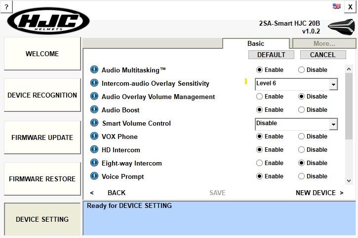 The Smart HJC Device Manager (aka the Sena Device Manager for HJC) is available from the OEM Sena page and once installed the application allows users to update their helmet systems to the latest firmware and configure device settings as desired; the settings can also be done by using the Smart HJC Mobile App.