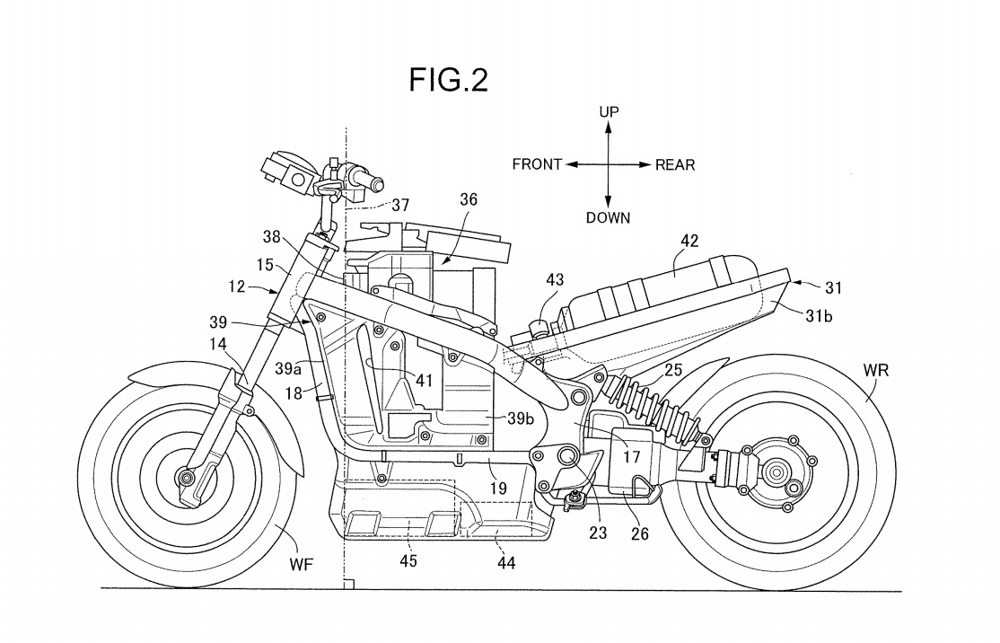The patent focuses on the air intake for a hydrogen fuel cell motorcycle. The intake moves air over the fuel cell to cool it. There is a small fan designed to expel air out behind the motorcycle, too. Power from the fuel cell, which sits more or less under the seat, will go to the rear wheel through what looks to me like a shaft drive.