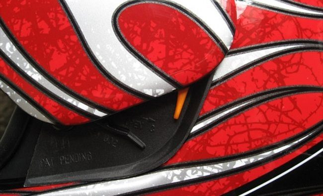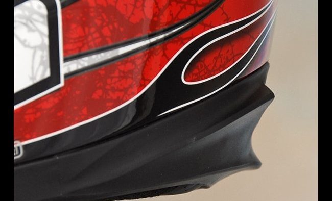 The graphics and the top vent/spoiler assembly conspire to make the helmet seem like it has a swept-back shape, and the overall impression is of an aerodynamic structure that surely will part the air smoothly and efficiently.