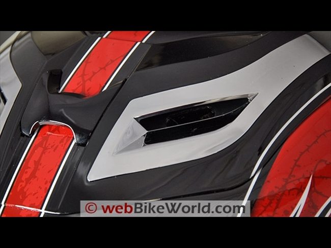 The graphics and the top vent/spoiler assembly conspire to make the helmet seem like it has a swept-back shape, and the overall impression is of an aerodynamic structure that surely will part the air smoothly and efficiently.