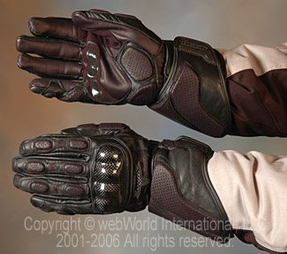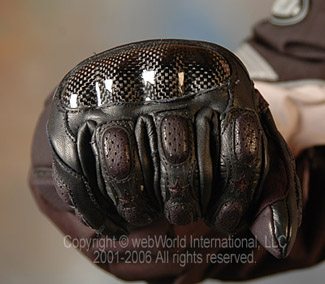 The knuckles are protected with a carbon fiber molding that is mounted on a “floating” section of leather that appears to continue down over each finger, offering a double layer of protection.