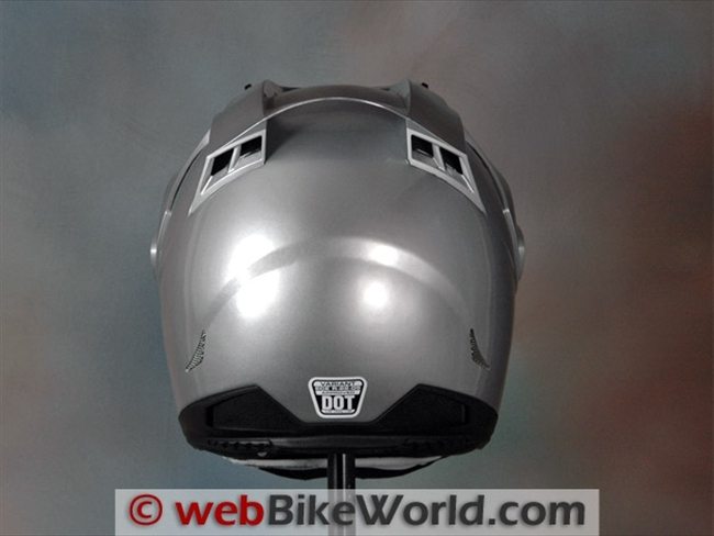 The rear exhaust vents on the Variant are incorporated into the spoiler formed by the rear of the top sun peak and they are matched by a smaller pair of mesh-covered vents at the bottom rear of the helmet.