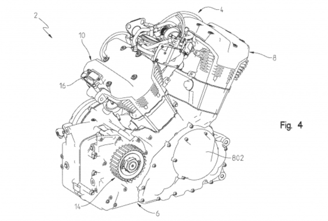 The engine outlined in the patent filing is a 60-degree V-Twin with a single-overhead-cam and four valves per cylinder. There’s a water pump on the left side of the engine for liquid cooling. Motorcycle.com was able to work out through an unnamed source that the engine will have a 1770 cc displacement and connect to a six-speed transmission. It will put out somewhere around 120 hp.
