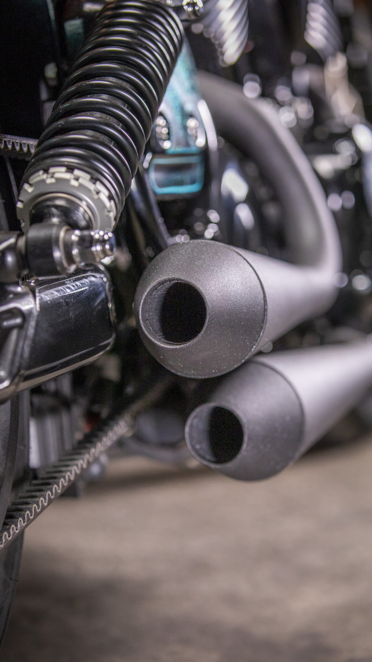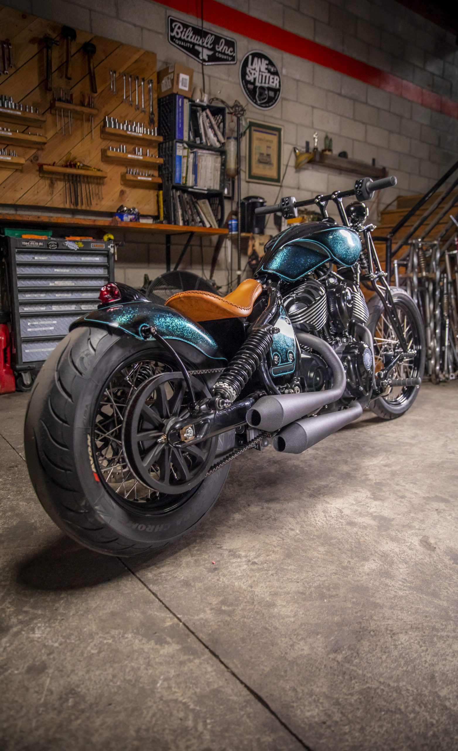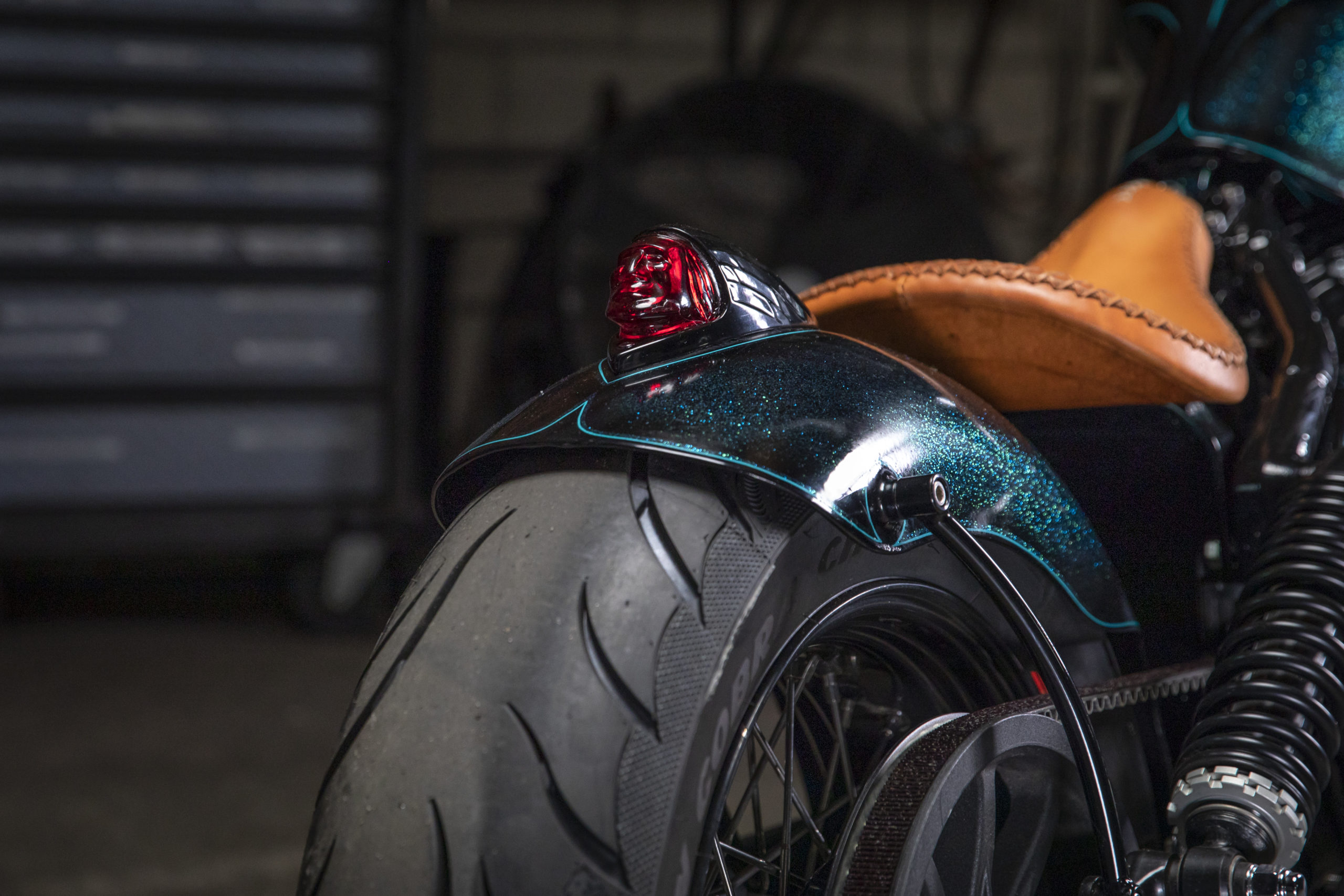 - Custom rear end set up (shorter/bobbed rear fender and more traditional external struts that mount at the swingarm to get the fender to ride close to the tire)
