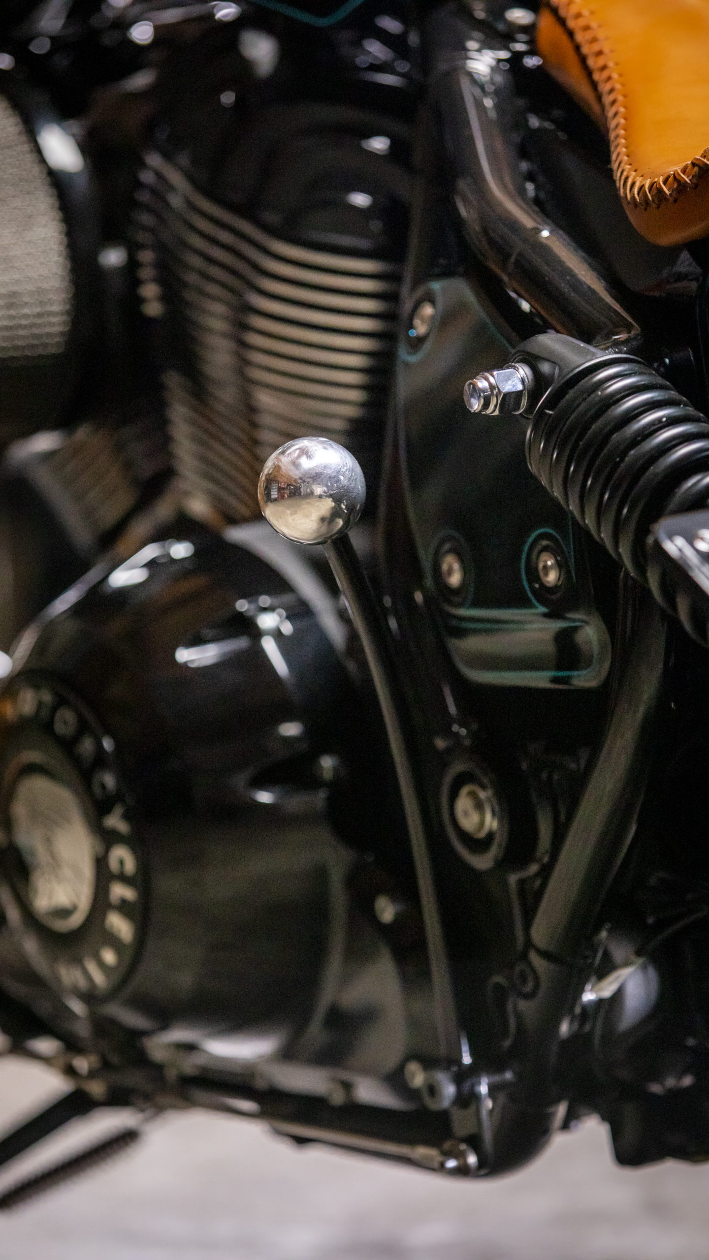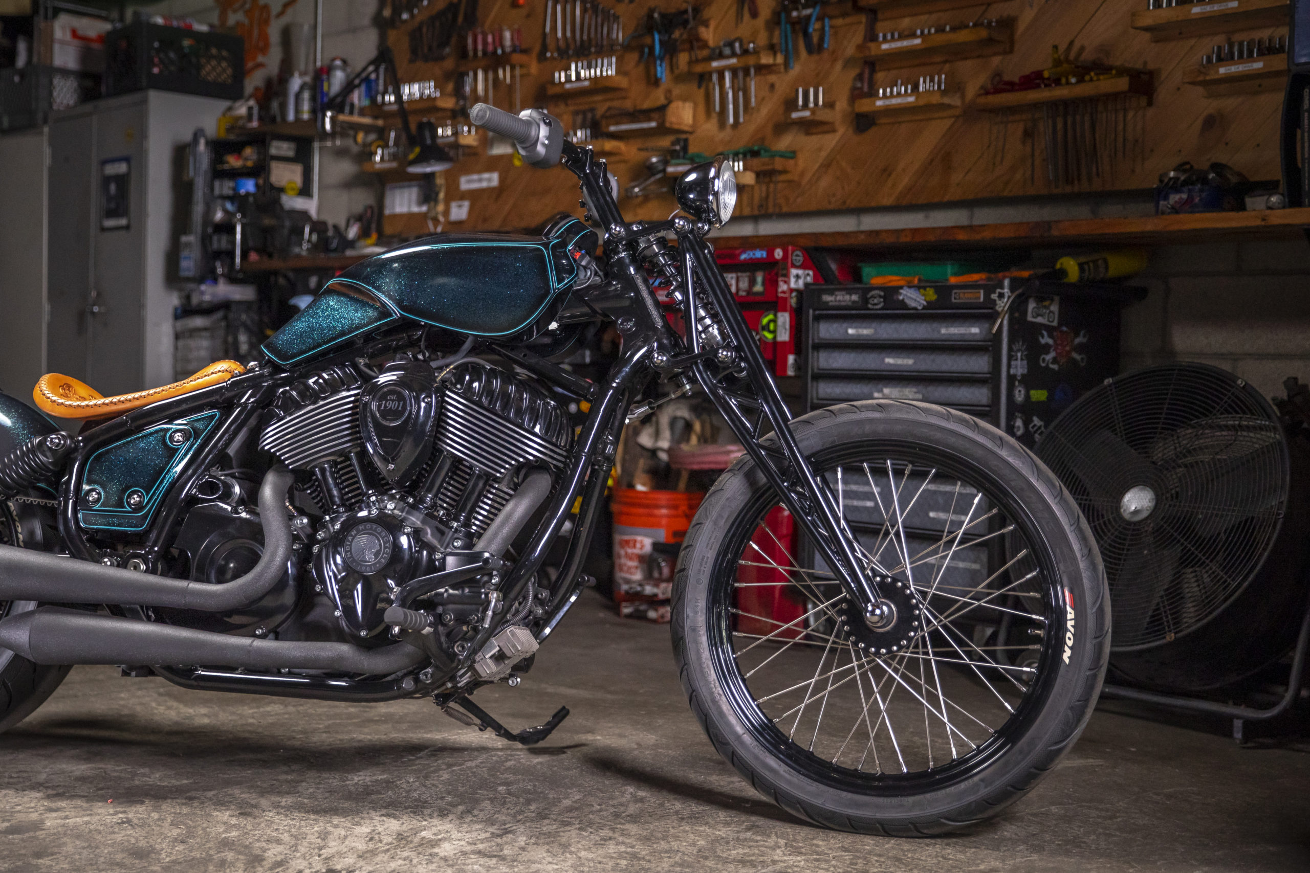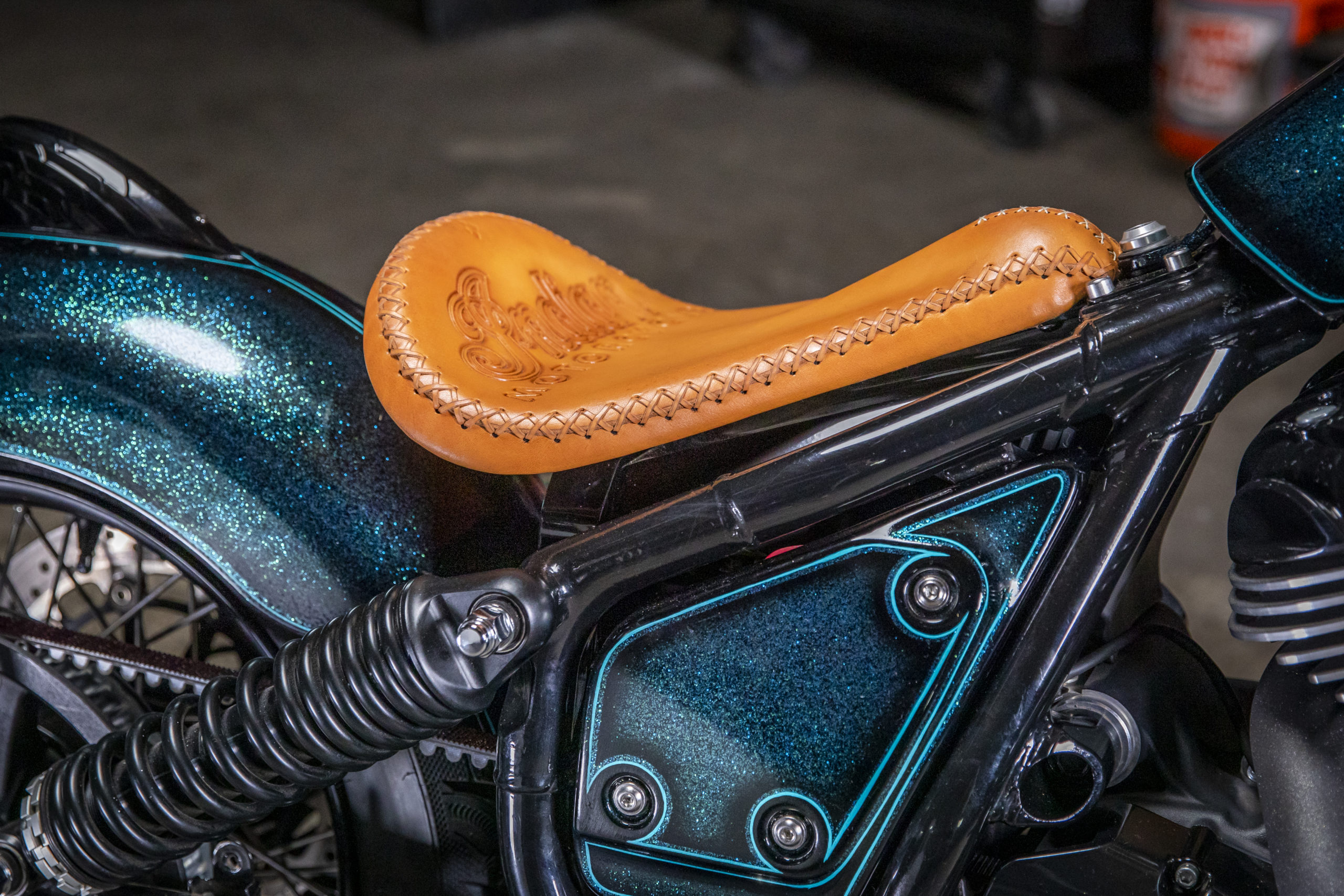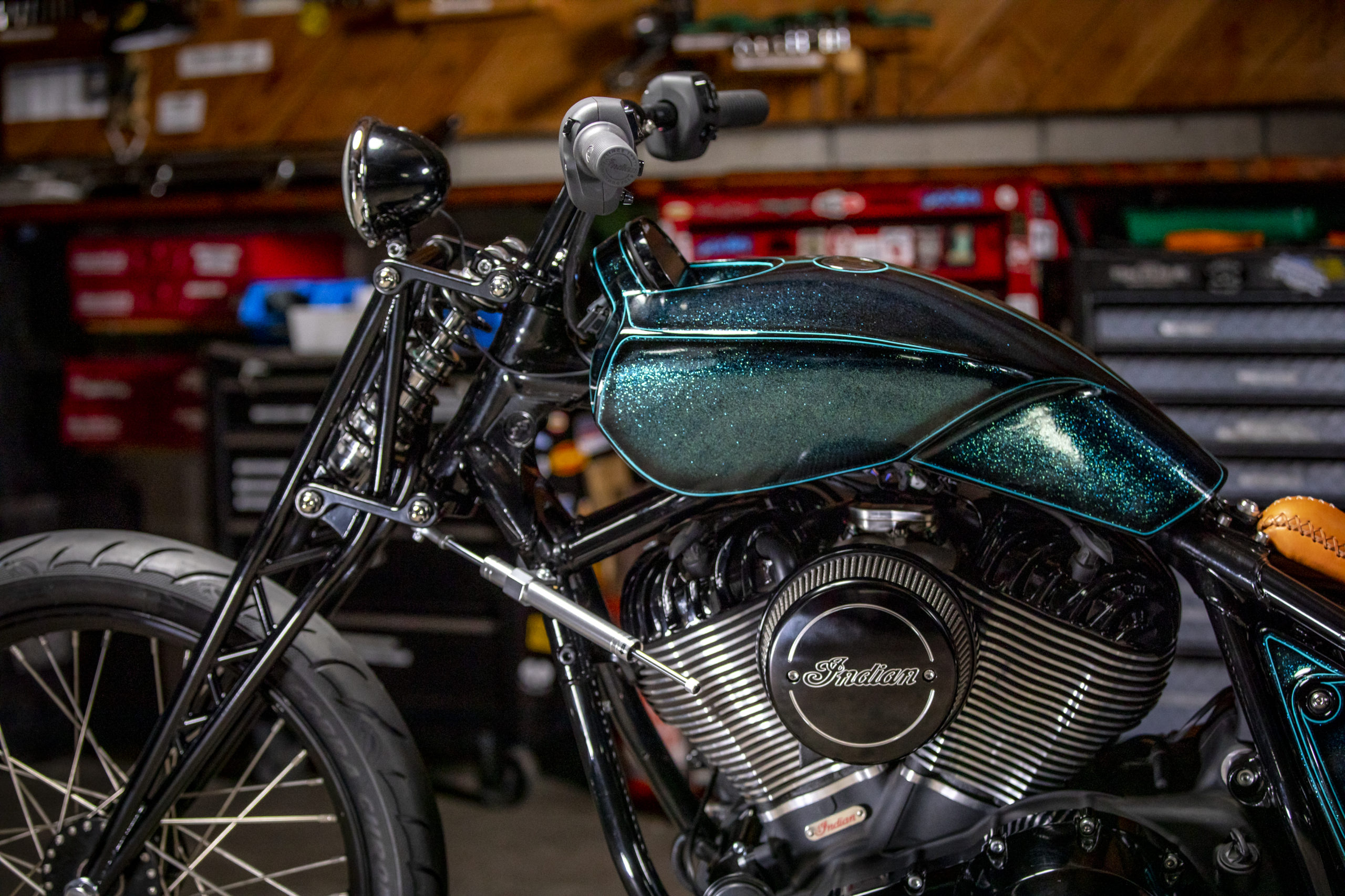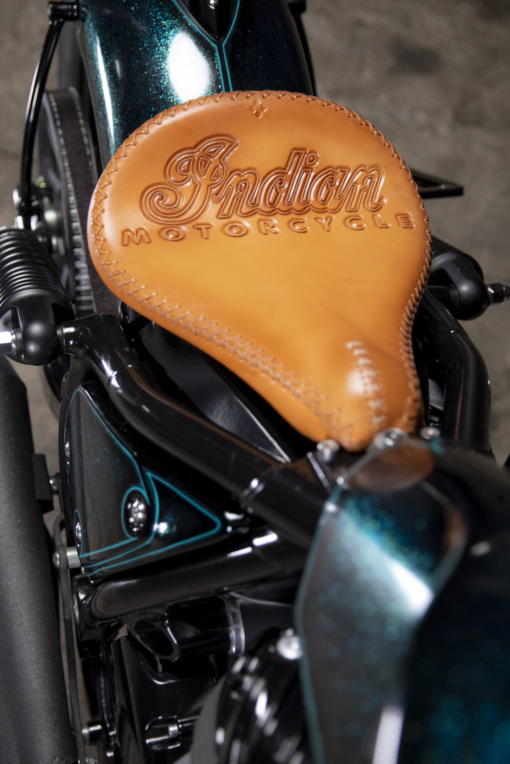 - Custom leather seat with the Indian Motorcycle script logo etched into the leather