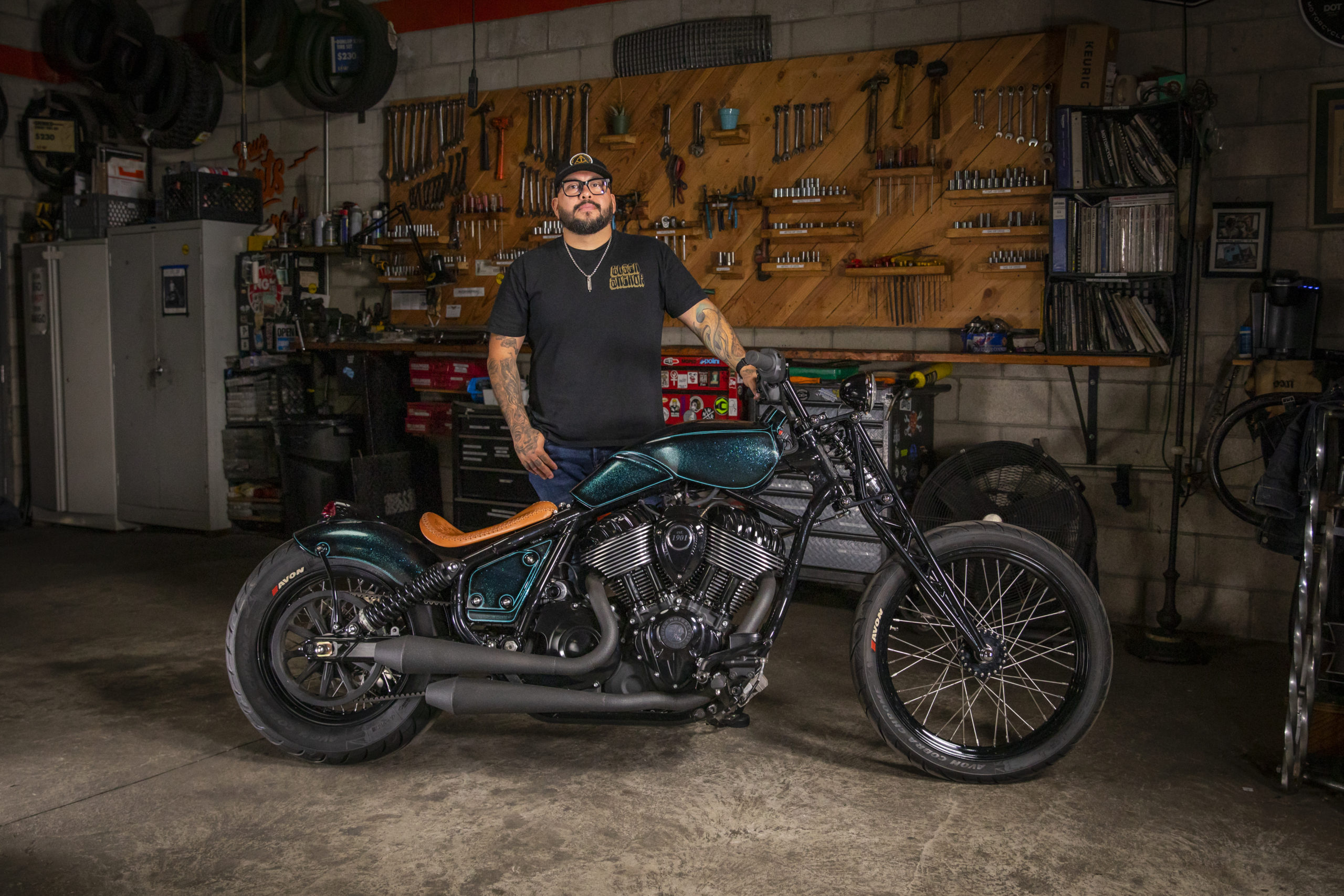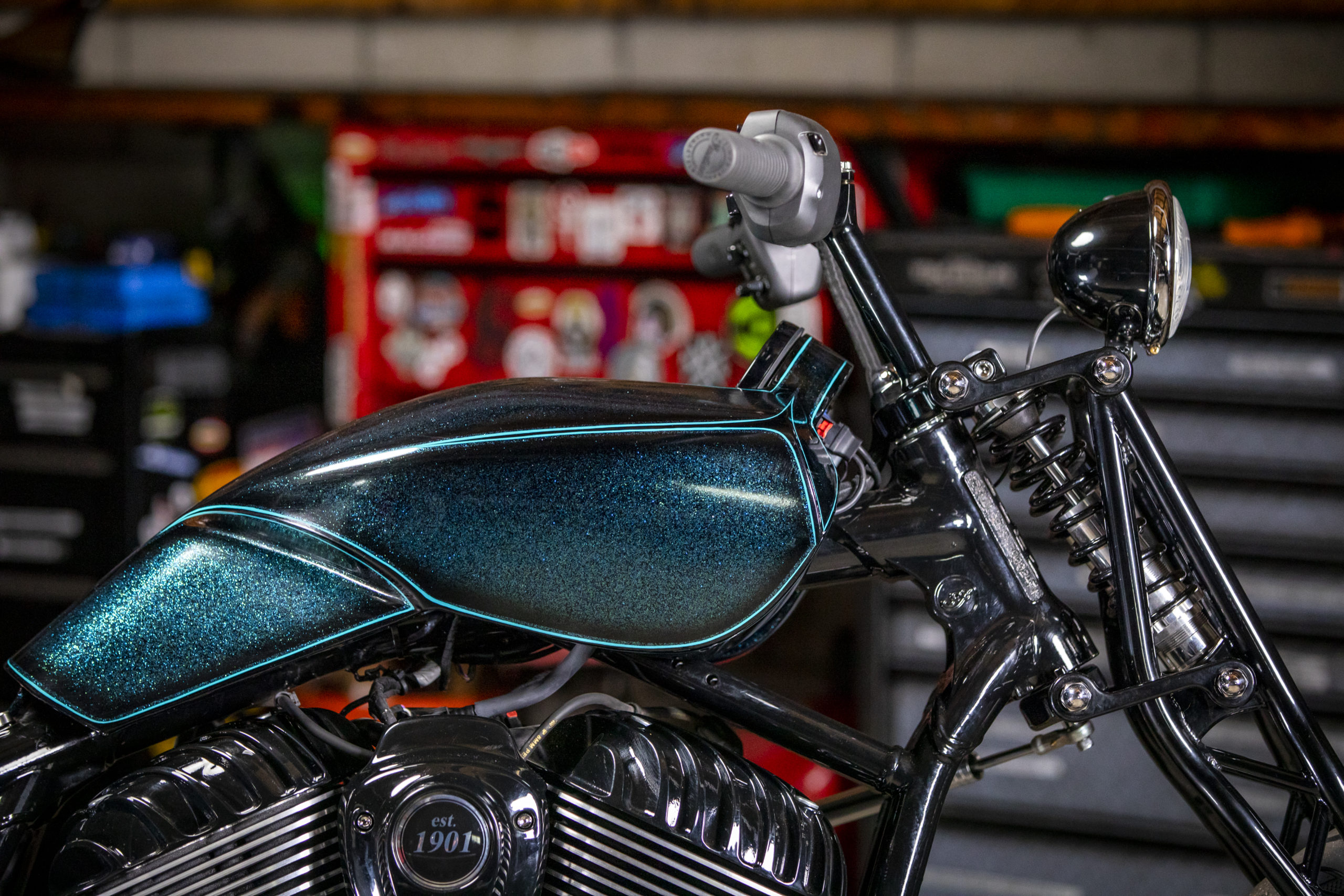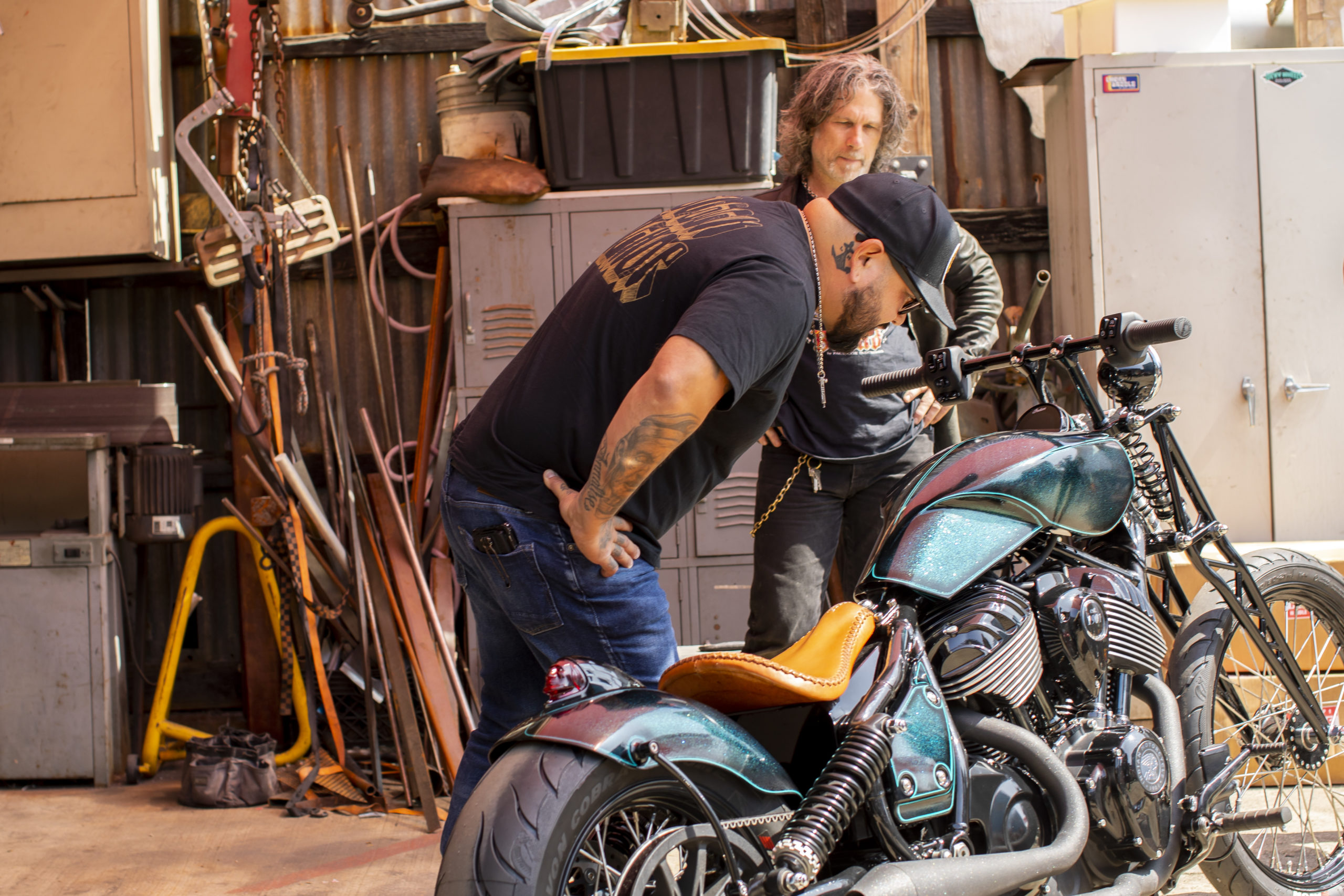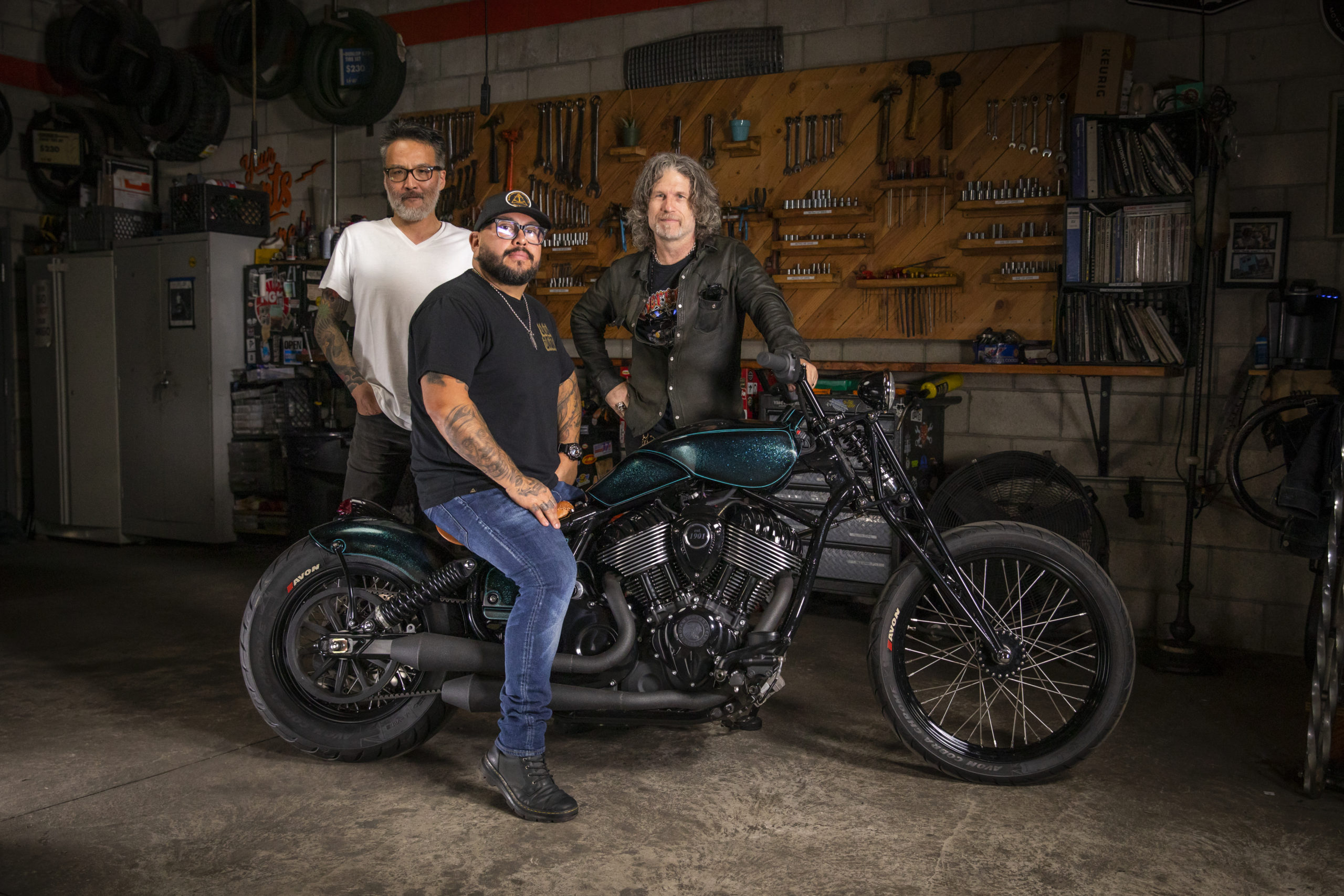 At the canvas were Indian Larry, a motorcycle builder, stunt rider, and artist, alongside custom bike build giants Paul Cox and Keino Sasaki – a trifecta of talent, working together to create a masterpiece.