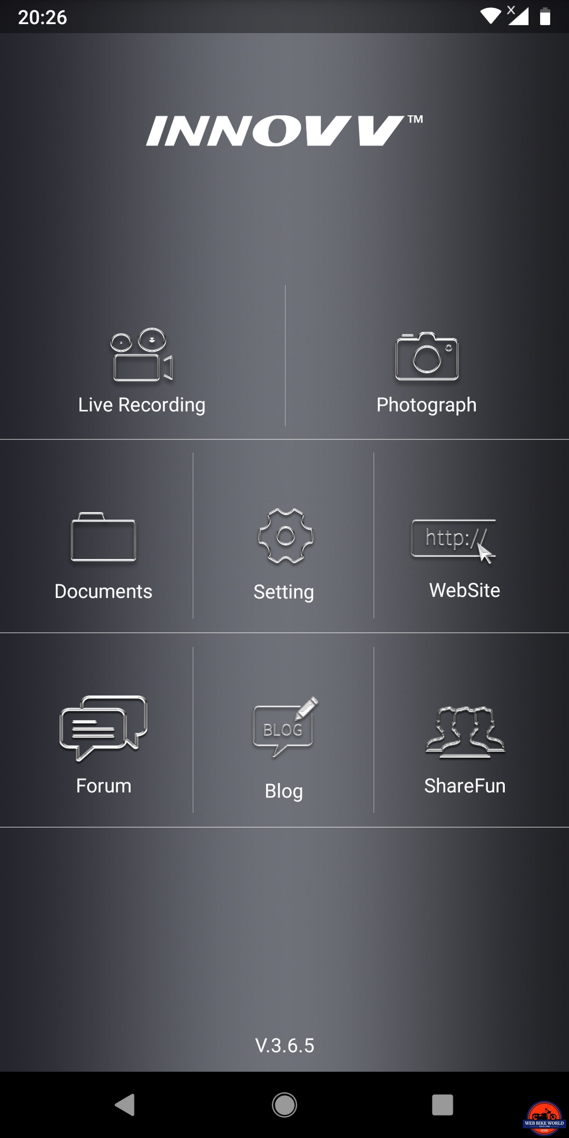 With WiFi connected, the Green LED stops flashing. At this point the INNOVV C5 app is launchable, providing desired setup adjustments to be made or in going directly to the video Live View screen, or Photo Mode – either of which allows more specific aiming of the camera lens.