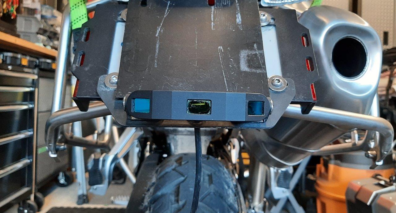 The sensor side of the system is a distinctively shaped sealed module fitted to the back of the motorcycle, typically the lower license plate frame or fender area using an aluminum plate and L-shaped adapter brackets; some of the mounting kit pieces have or are being modified for the release version.