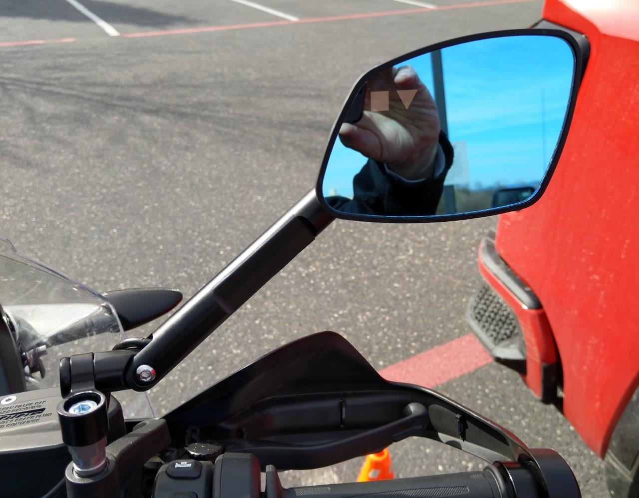 It is indeed a lightweight and adaptable layout, but in use, if there is any vibration through the bars (even the little generated by the parallel-twin Beemers) or when the motorcycle is taken off-road, the mirrors begin to move around on the mounts as the hardware loosens up at the joint points.