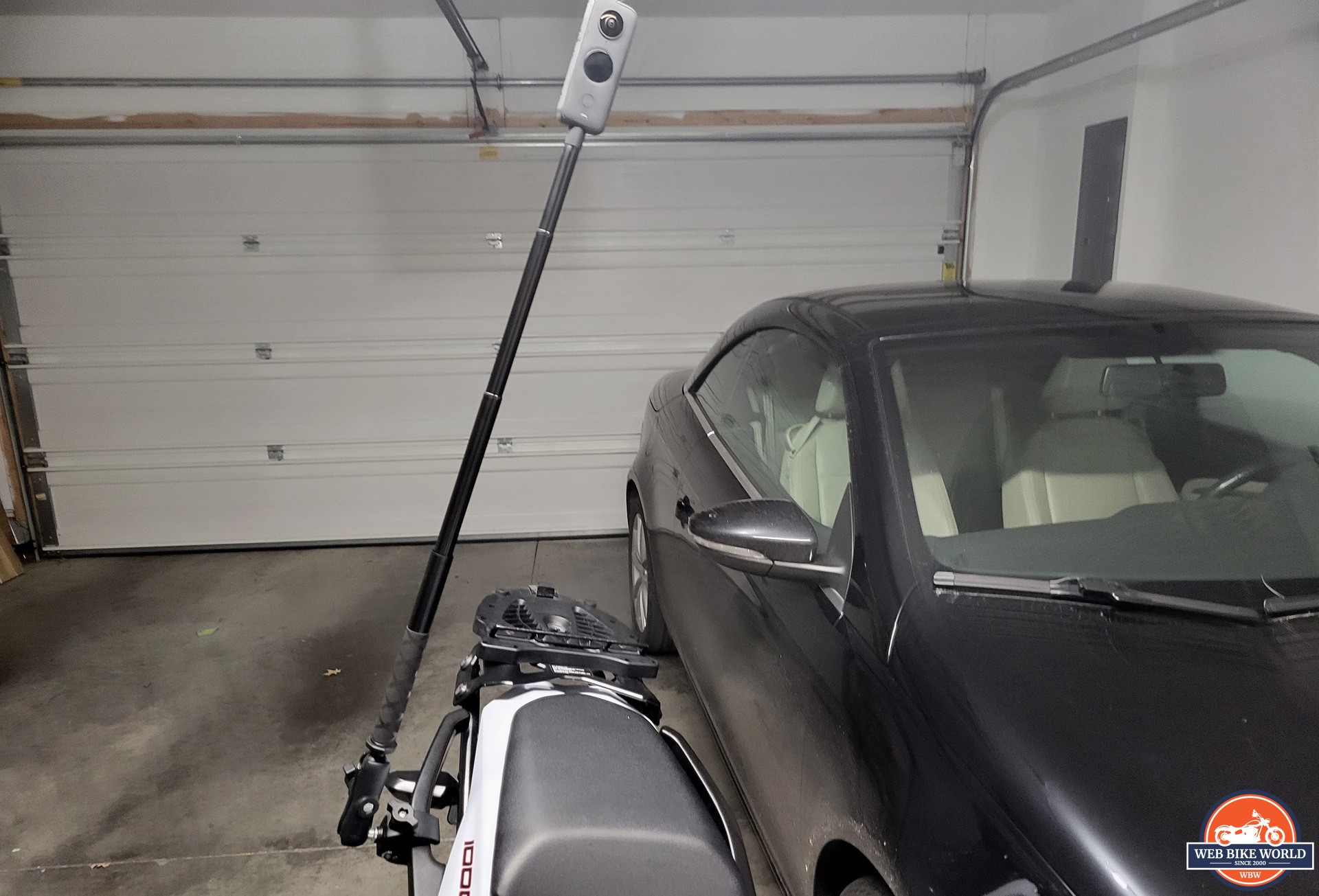 Image of the questionable setup. I wasn’t sure if this was a good idea. It wasn’t. The selfie stick was actually straight up and down but the bike is on its side in this photo.
