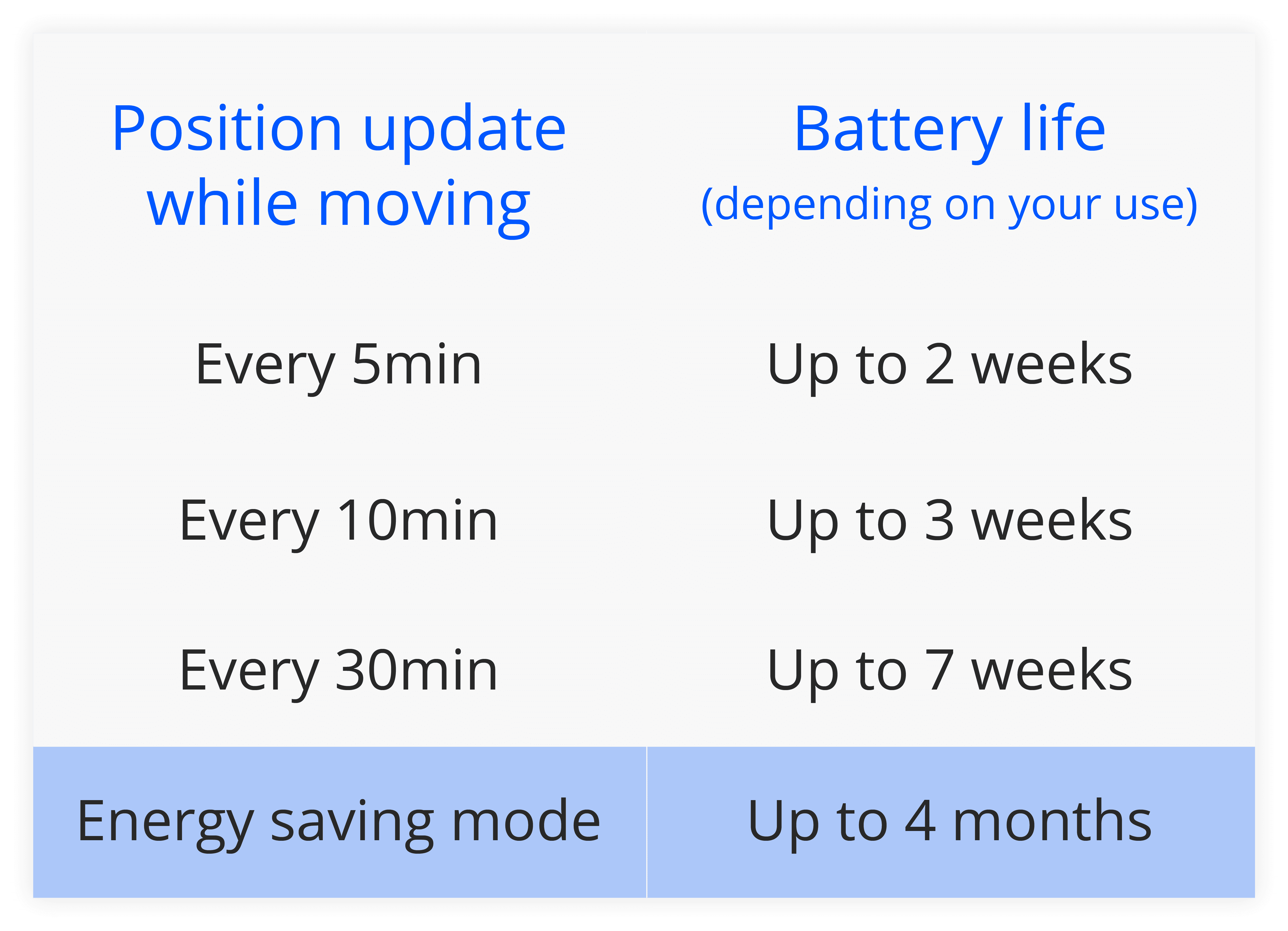There are three settings for location update frequency; High (every 5 to 7mins), Standard (every 10 to 12mins), and Low (every 30 to 32 mins). If the bike is stationary, it only updates the position every 24 hours to save the battery.