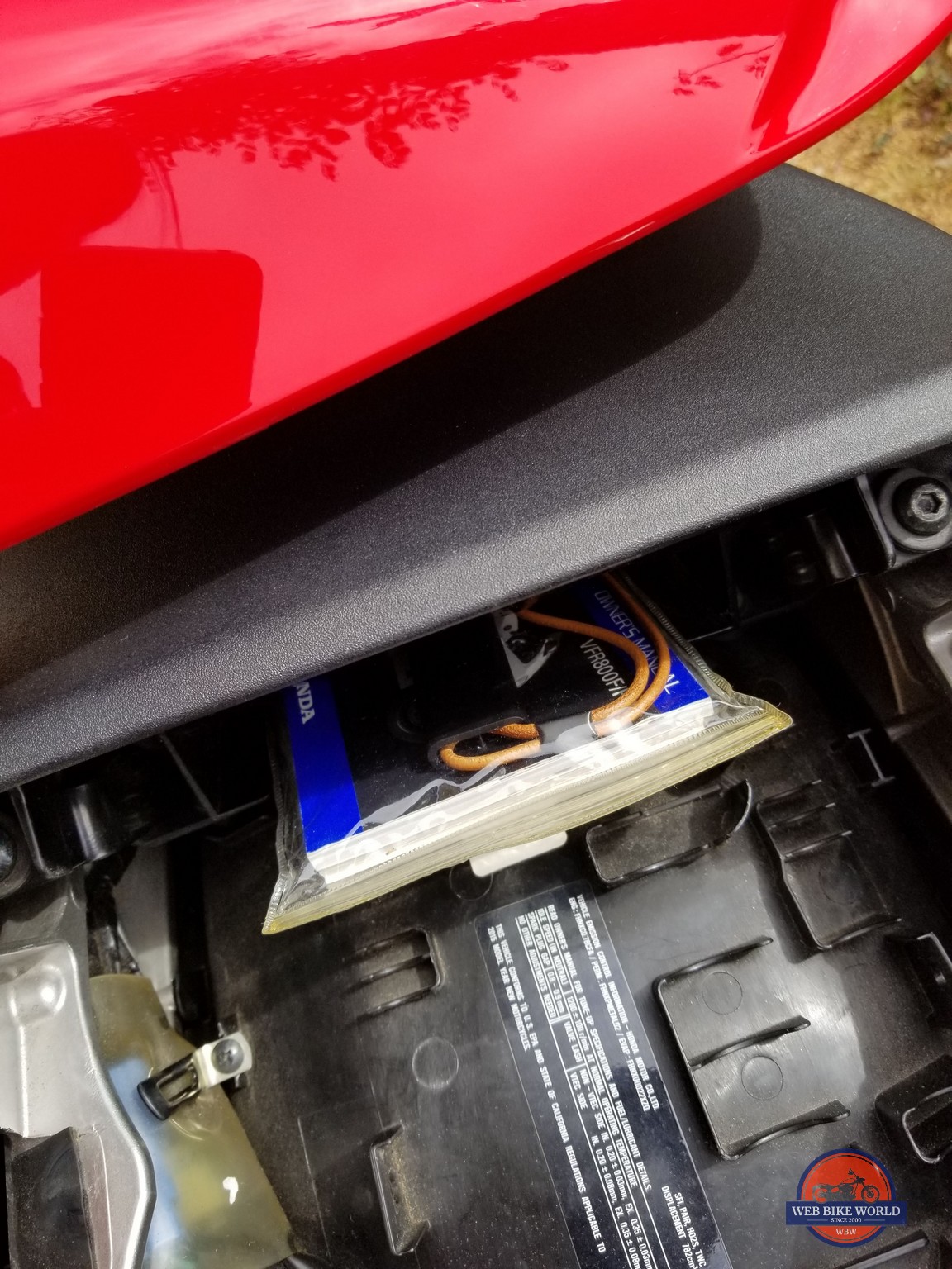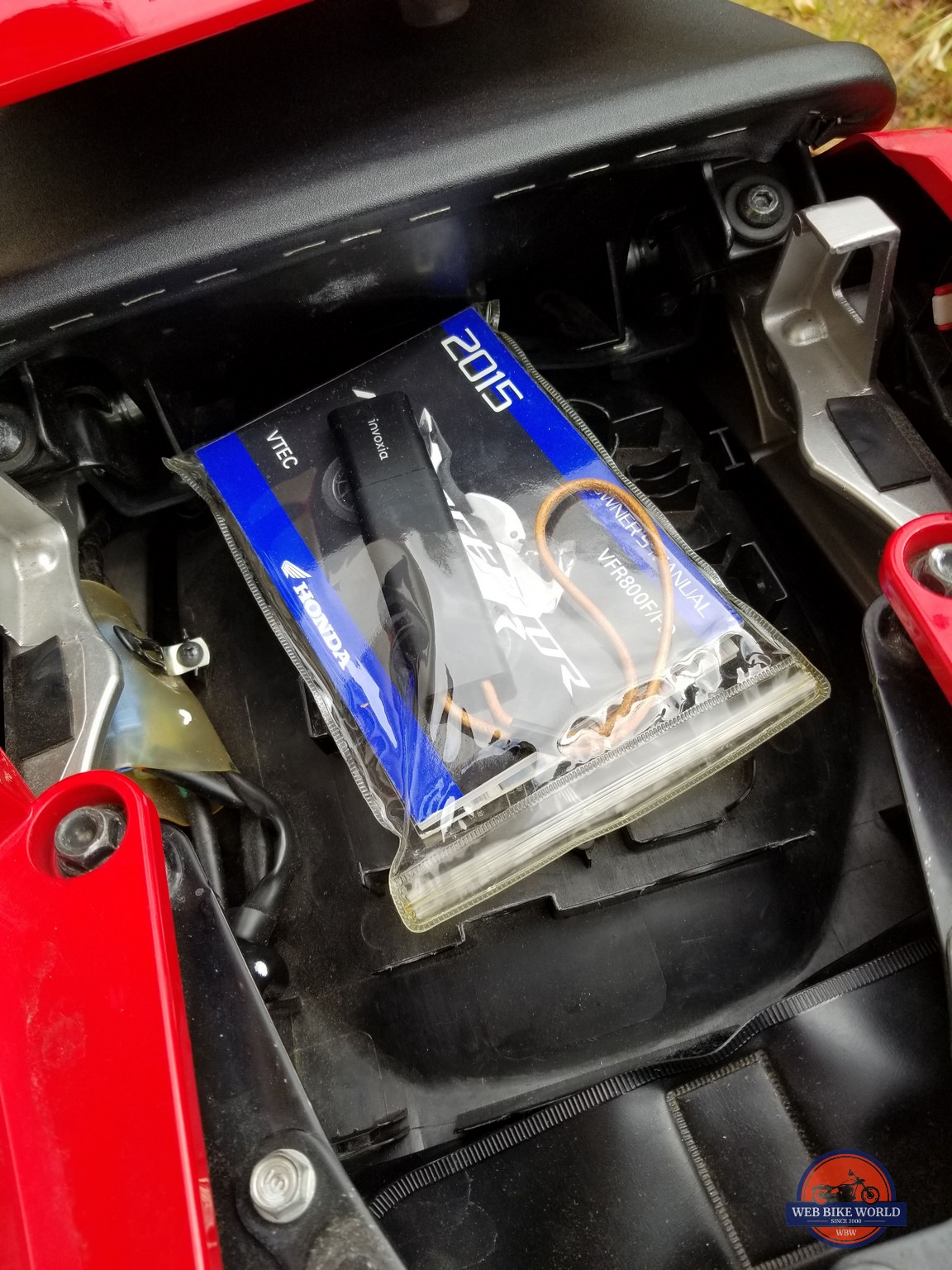 On the second ride, the local weather forecast was showing a slight chance of rain. So I put the tracker in the vinyl bag in which the bike’s owner’s manual is kept. My Honda VFR has a slot for the manual in the tail storage area, and the device didn’t move much during the ride this time.