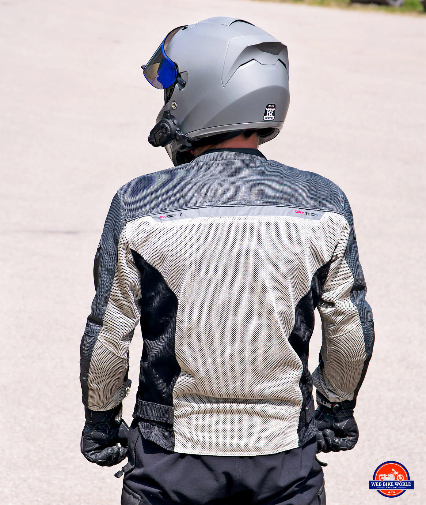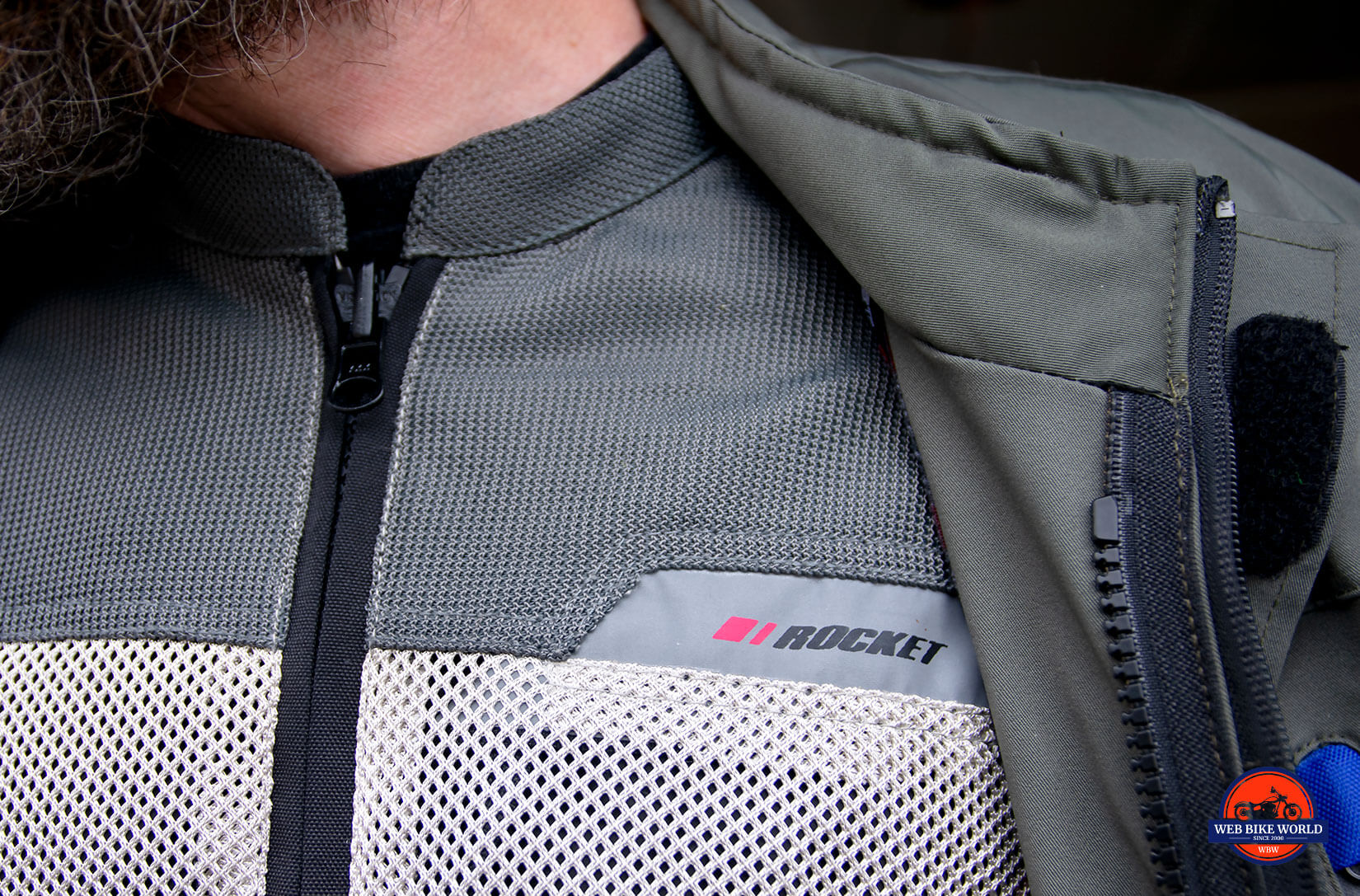 The middle layer is the actual jacket and will be worn predominantly on its own minus the other two layers. It’s a nylon mesh with large openings in the white-colored areas covering the wearer’s torso, inner arms, and back. There’s a silver-grey-colored, tighter-knit mesh for the impact areas being the shoulders running down the arms in line with the elbows.