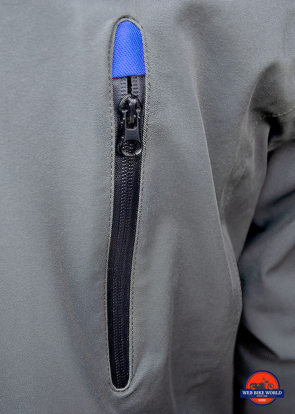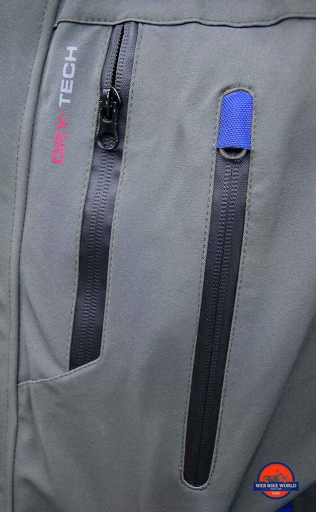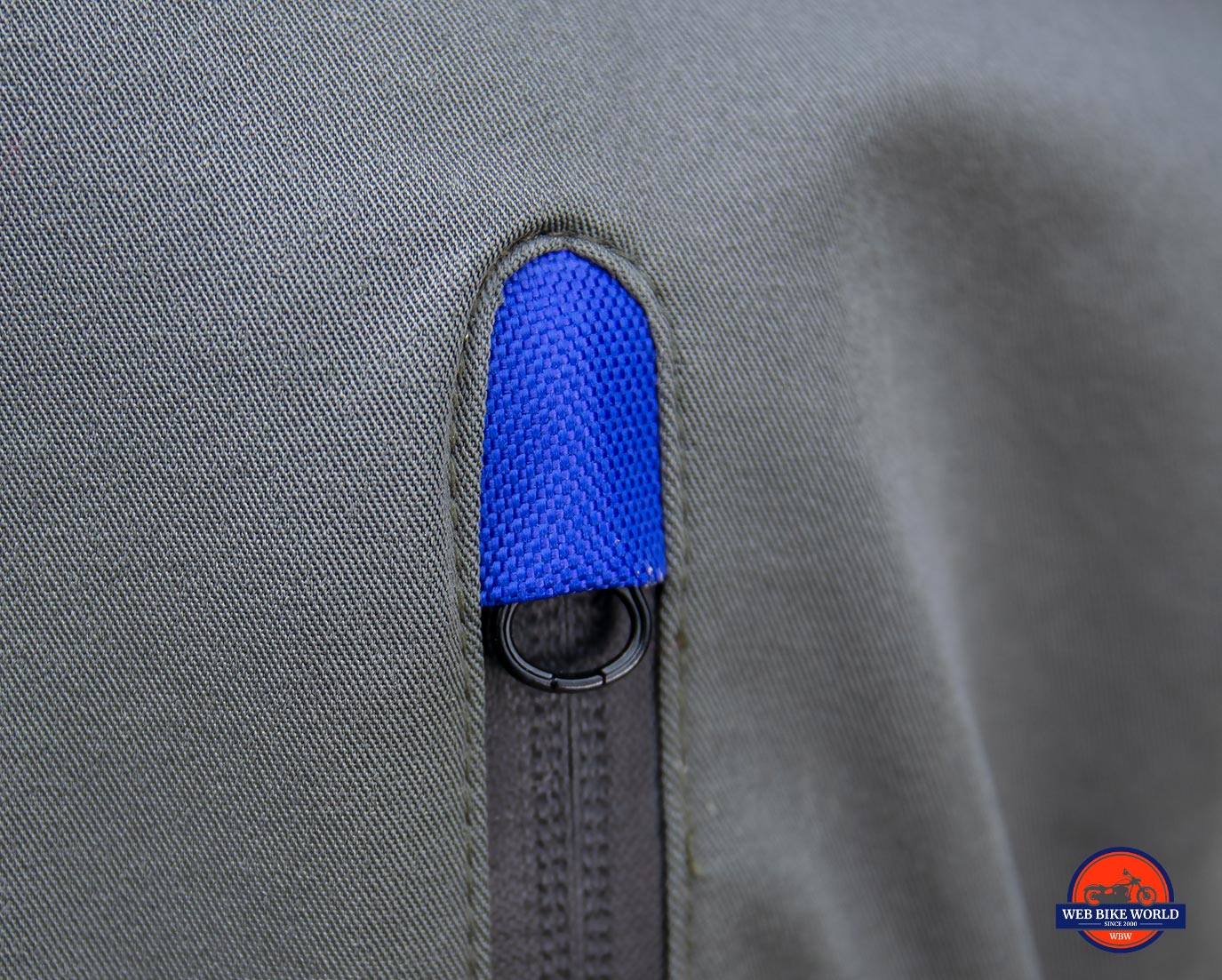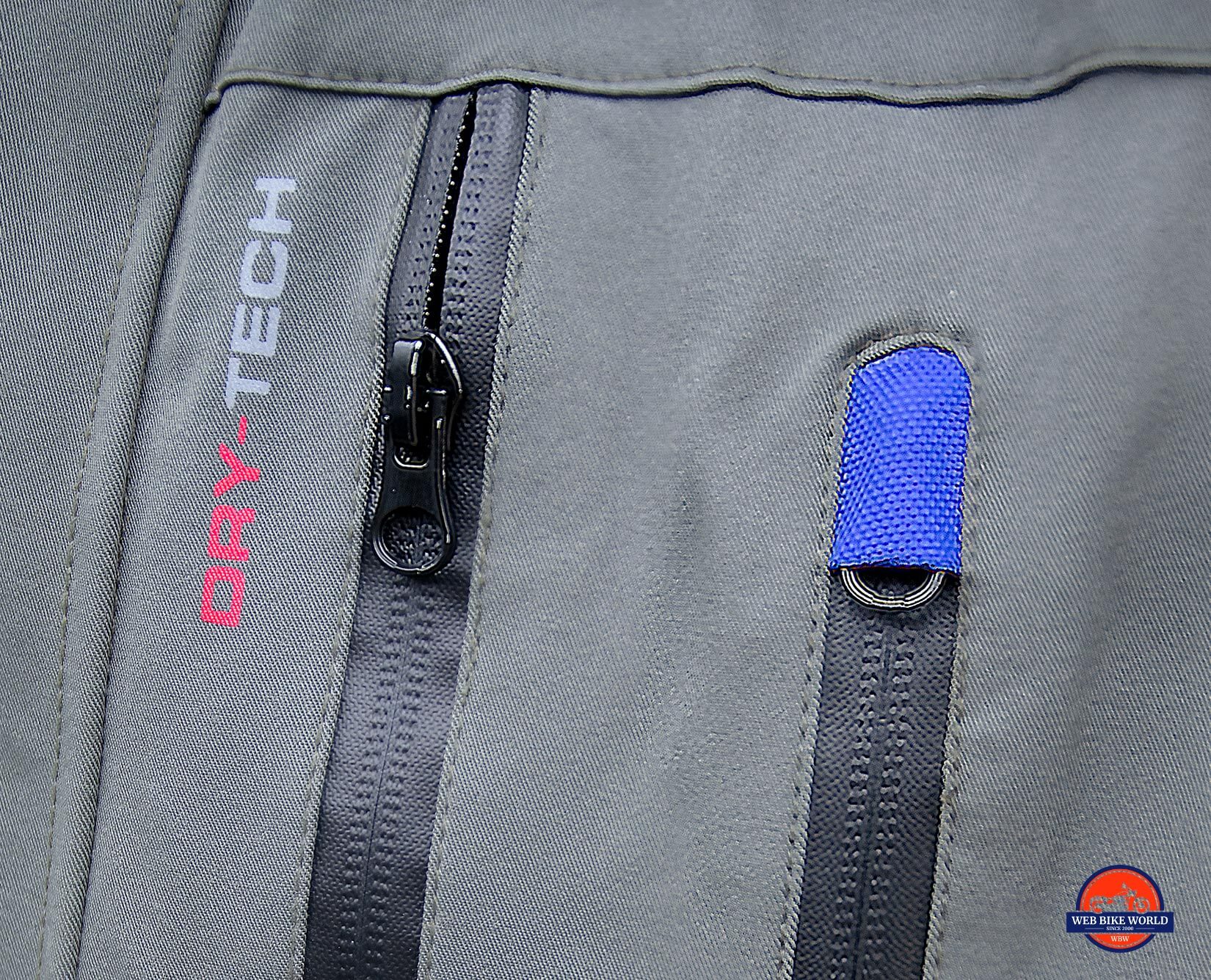 Small blue “hoods” sit on the top of each vent and pocket on the outer waterproof jacket layer. These are to allow the YKK zipper heads to be tucked away partly out of sight. Presumably these “zipper garages” aim to stop it from flapping in the wind or allowing water to pass through.