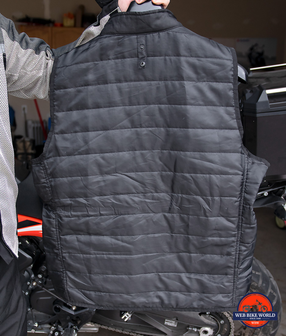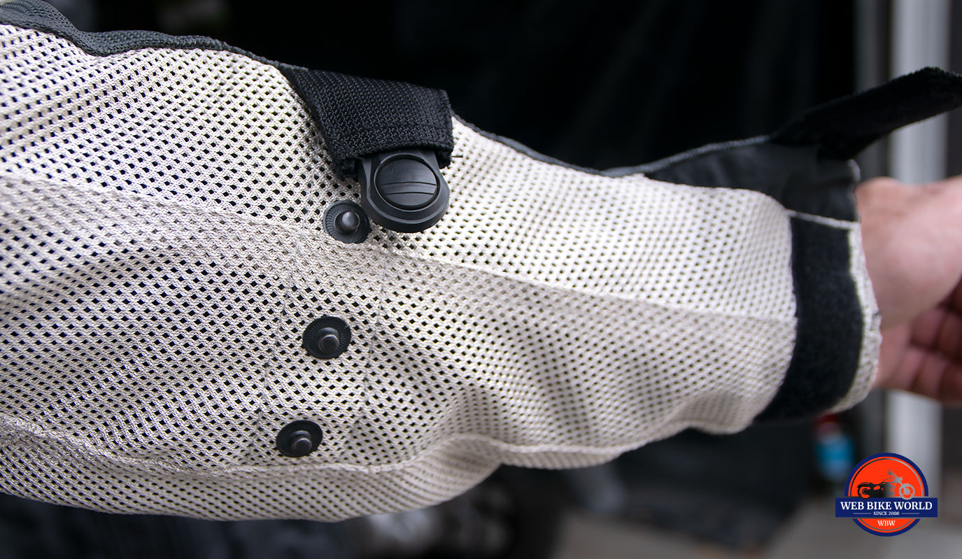 On the middle mesh layer, the abdomen, chest, neck, and back regions all fit me perfectly. It’s snug but not constrictive everywhere except for the back of my shoulders. Perhaps I haven’t spent enough time lifting my motorcycle lately and my upper arm muscles have shrunk over the past year, but I notice some saggy mesh material in those areas on the jacket.