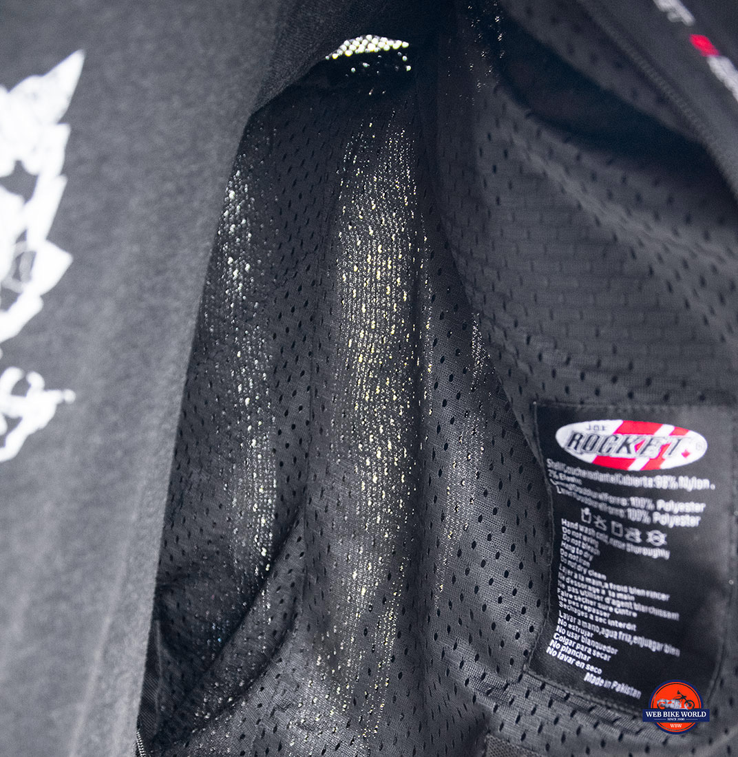 The Joe Rocket brand name is printed in silver on the left wrist and on the upper chest area on a thin band of Hi-Viz reflective material. Just enough to let you know who built this, but not too much to be obnoxious.