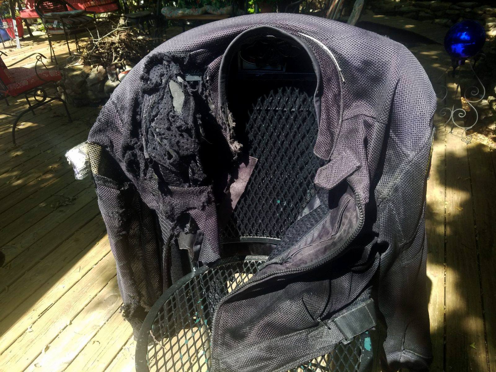 Recently I came across a post on Facebook where a rider shared these photos of his mesh jacket after crashing at highway speed due to a deer strike. The rider sustained serious injuries and as you can see the jacket was completely destroyed due to the impact and slide. Even though this isn’t a Joe Rocket Canada mesh jacket in the photo I suspect it would perform the same way.