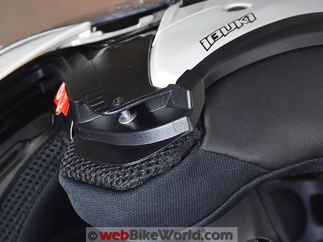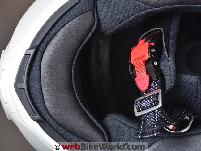 The Ibuki has a rather large quick release chin strap retainer. A lighter, simpler and proven double D-ring type is preferred. The chin strap has a metal D-ring for locking via a cable to the bike. The chin strap padding is generous.