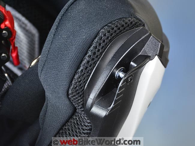 The visor clamps or “jaws” that lock the rotating flip-up visor closed are half plastic and half metal. They clamp around a metal post. The system isn’t the most solid-feeling I have tried, with some fore/aft play and lateral flexibility.