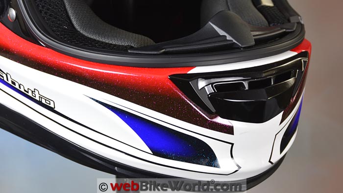 This area could use more padding, as noise leaks in through the back and can be heard as the air rushes through the space between the bottom of the helmet and the rider’s neck.