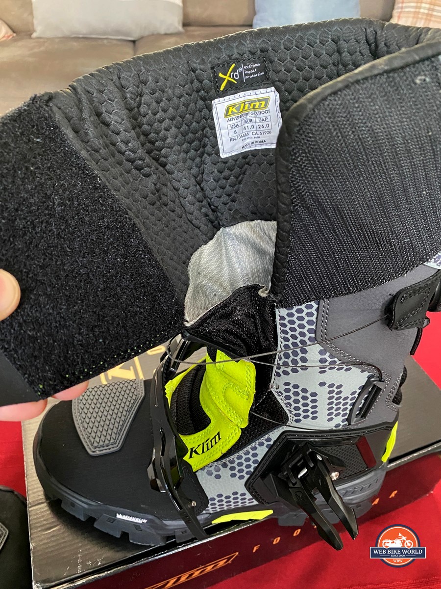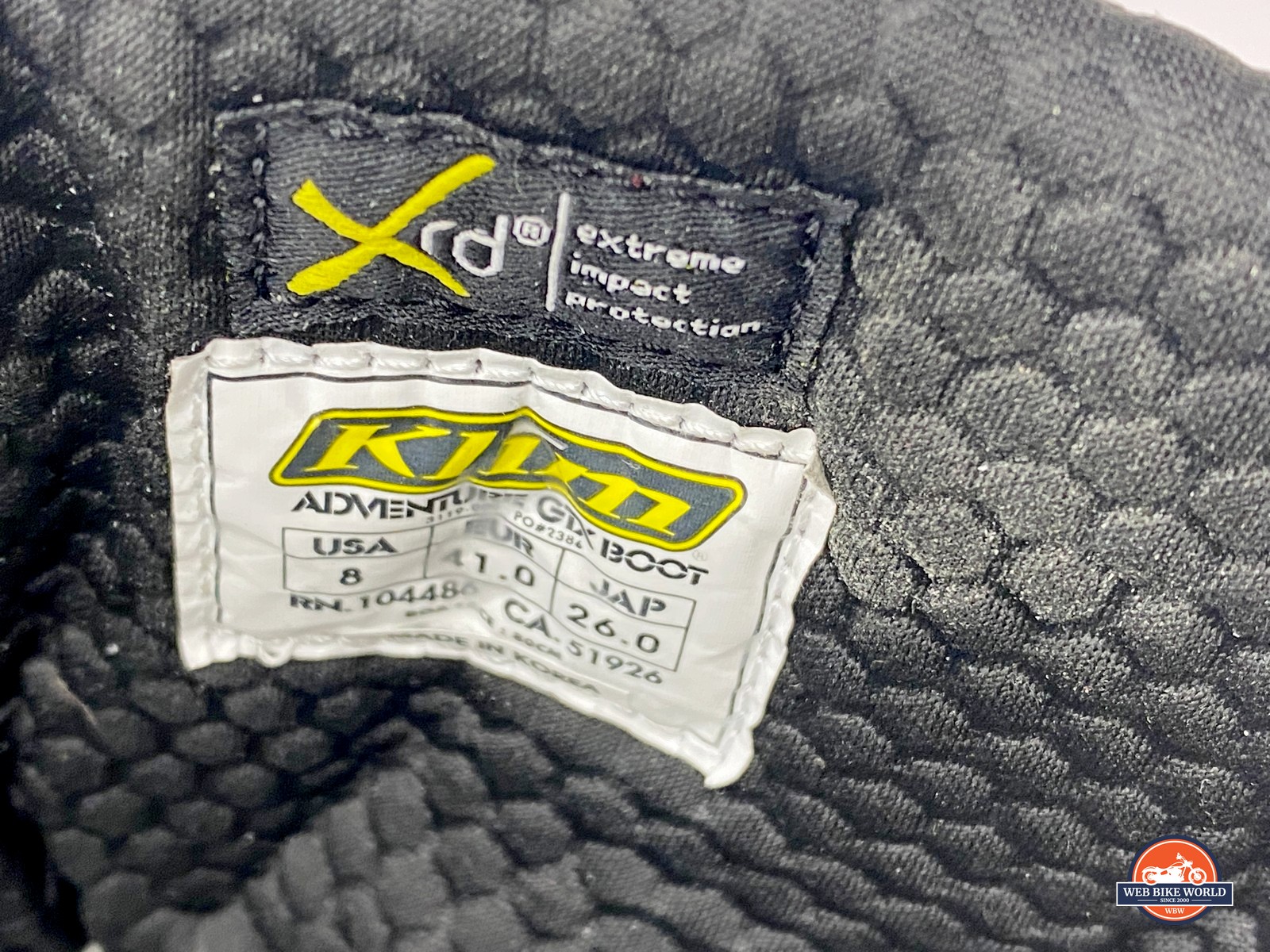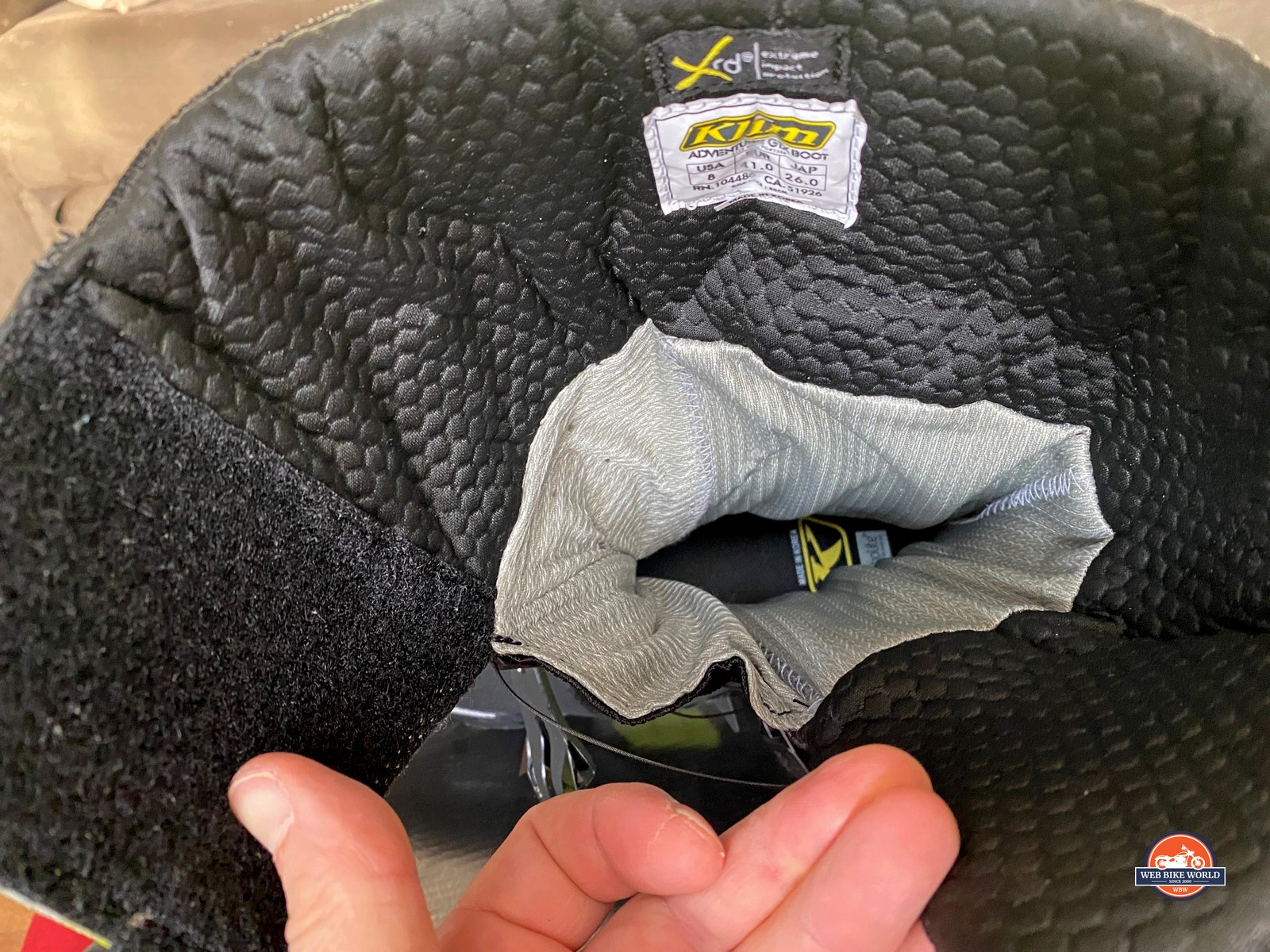 This is the “5MM XRD® IMPACT PROTECTION FOAM ANKLE PUCKS and 5MM XRD® IMPACT PROTECTION FOAM MID-FOOT TOP PADDING” mentioned in the Klim brochure. Klim is banking on thick, soft padding to protect the wearer from ankle injuries, which I’m not sure will work in some crash scenarios while in others I think it will.