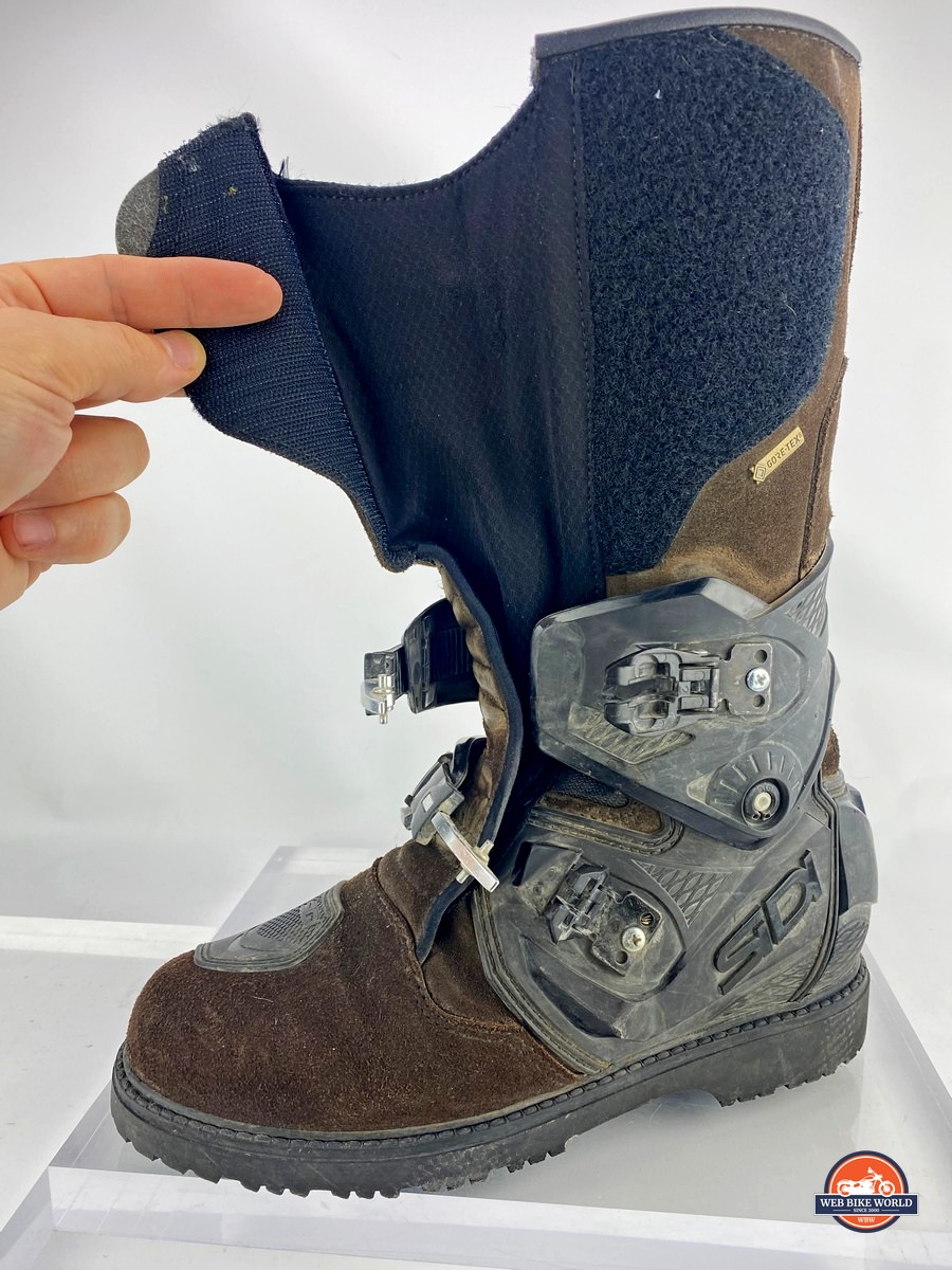 For the Sidi boots, there’s hope for you, my friend. The reason being that Sidi had the wisdom to design in a big patch of elastic right at the top of the boots where your calf would sit. It only reaches down about 3 or 4 inches though, and I have some doubts about the upper latch being able to close if your calf is thick further down your leg as well. It’s going to be close even with these Adventure Goretex 2 boots.