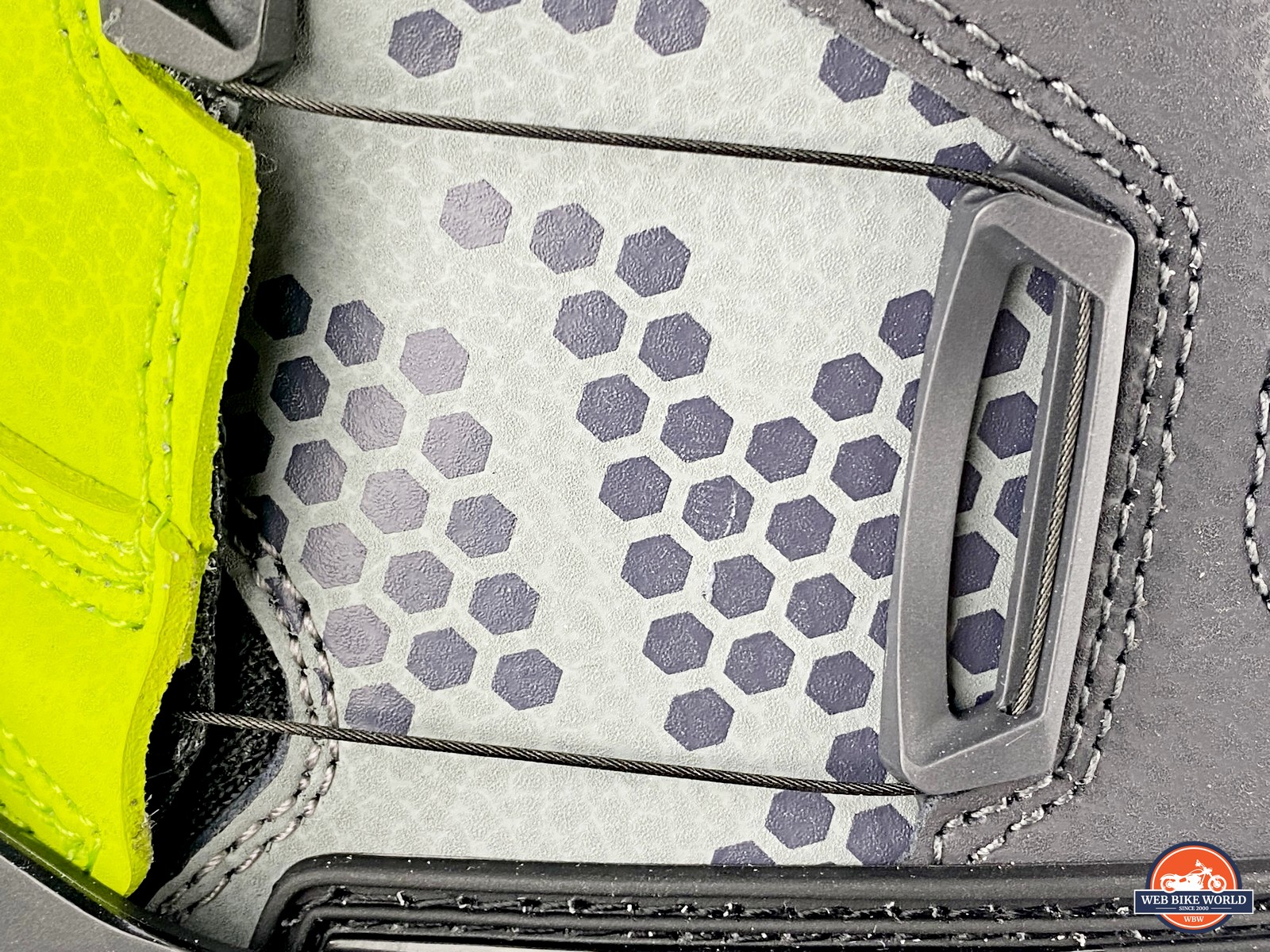 The uppermost portion of the Klim inner liner is black nylon with honeycomb-shaped indentations covering it. This pattern is one I’m familiar with for channeling perspiration outwards so your feet can breathe.
