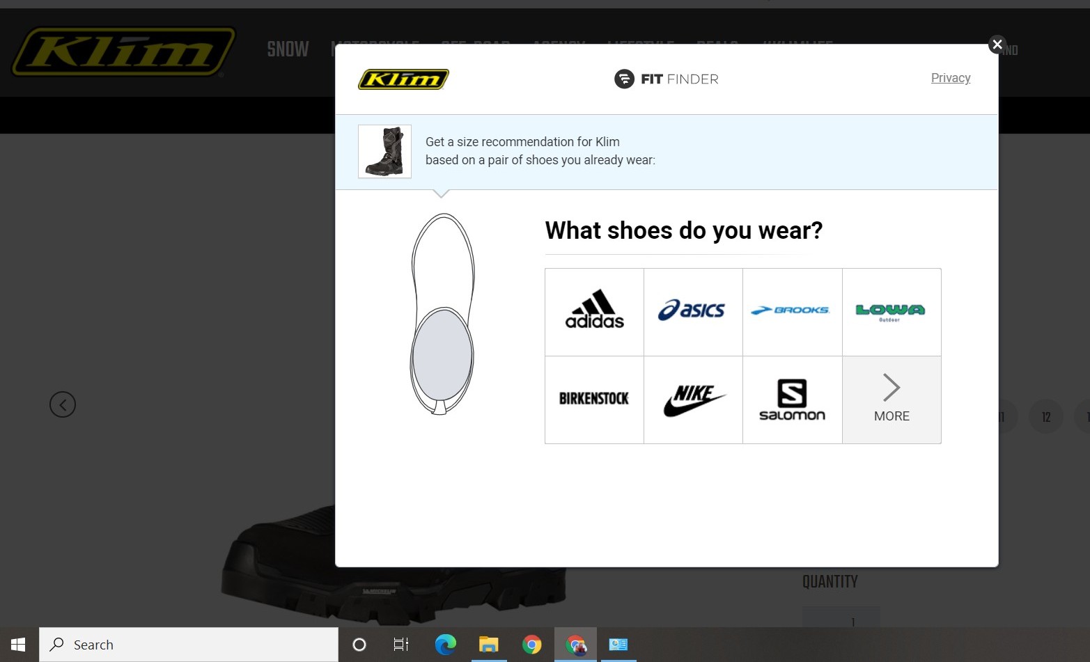 The fit wizard used my favorite pair of Asics running shoes as a reference point in determining this. The Wizard of Klim correctly predicted with an oddly specific 61% probability that I would be happy with the fit.