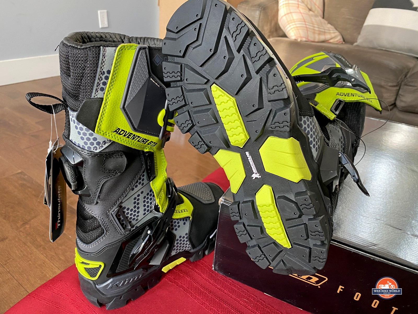 Immediately these boots grab my attention with their “in-your-face” styling, bold colors, and appealing adventure riding features. They look like motocross boots that were sent to prep school to take just enough of the wild side out of them.